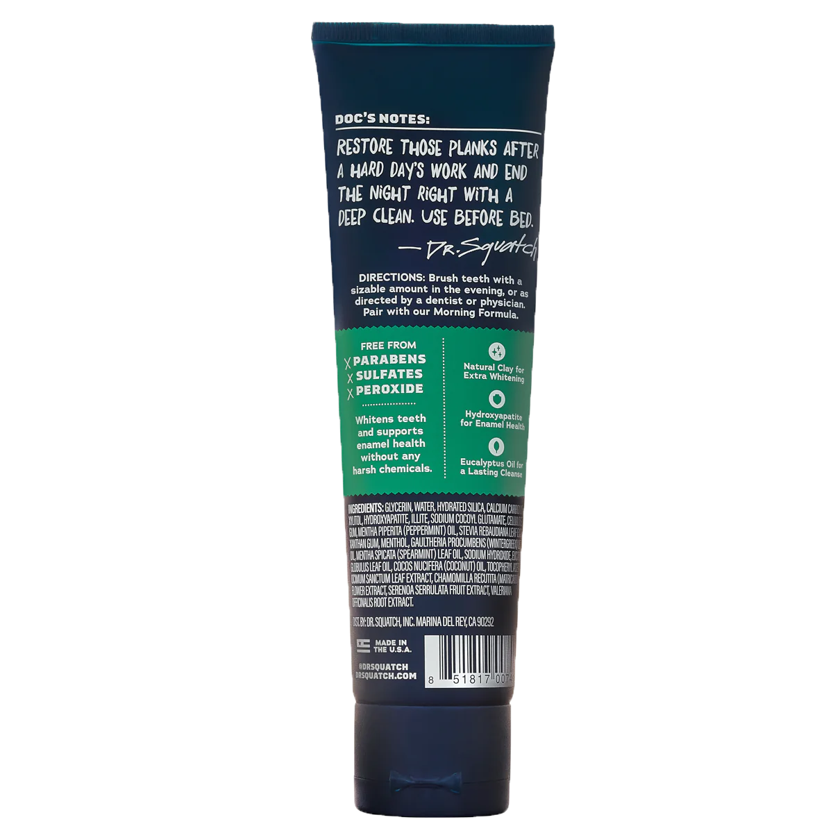 Dr. Squatch natural toothpaste for men is formulated specifically for your morning and night routines. Free from harsh chemicals, sulfates and parabens, our morning and night toothpaste duo fights sensitivity and supports enamel health around the clock with Hydroxyapatite, a natural calcium-based mineral identical to tooth enamel.