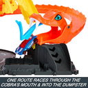 Take on a hungry cobra that has slithered into the pizza shop and save Hot Wheels City just like in the Netflix series Hot Wheels® Let's Race! Drive into the cobra's tail and release it to see which of three random paths the car will take. Will it race through the cobra's mouth and end up in the dumpster? Maybe it will have the unfortunate ride that ends in the creature's mouth. Or maybe it will send a pizza pie smack into the cobra's face, defeating it! The set features cool track play details to inspire storytelling adventures and can connect to other Hot Wheels City sets for open-ended play. Each sold separately. One Hot Wheels car is included. Colors and decorations may vary.