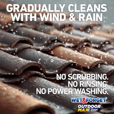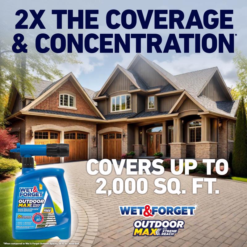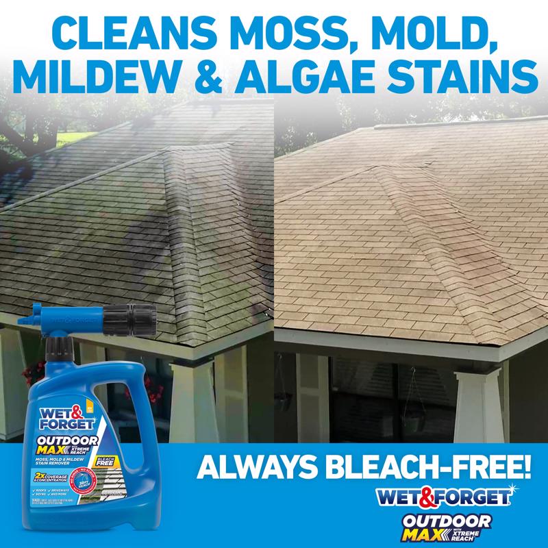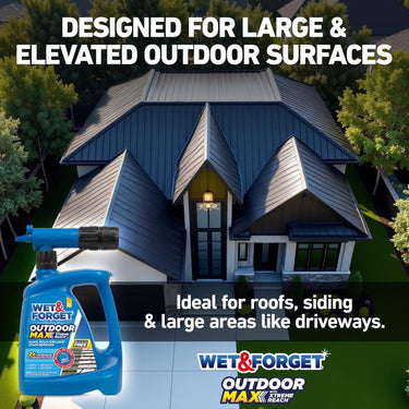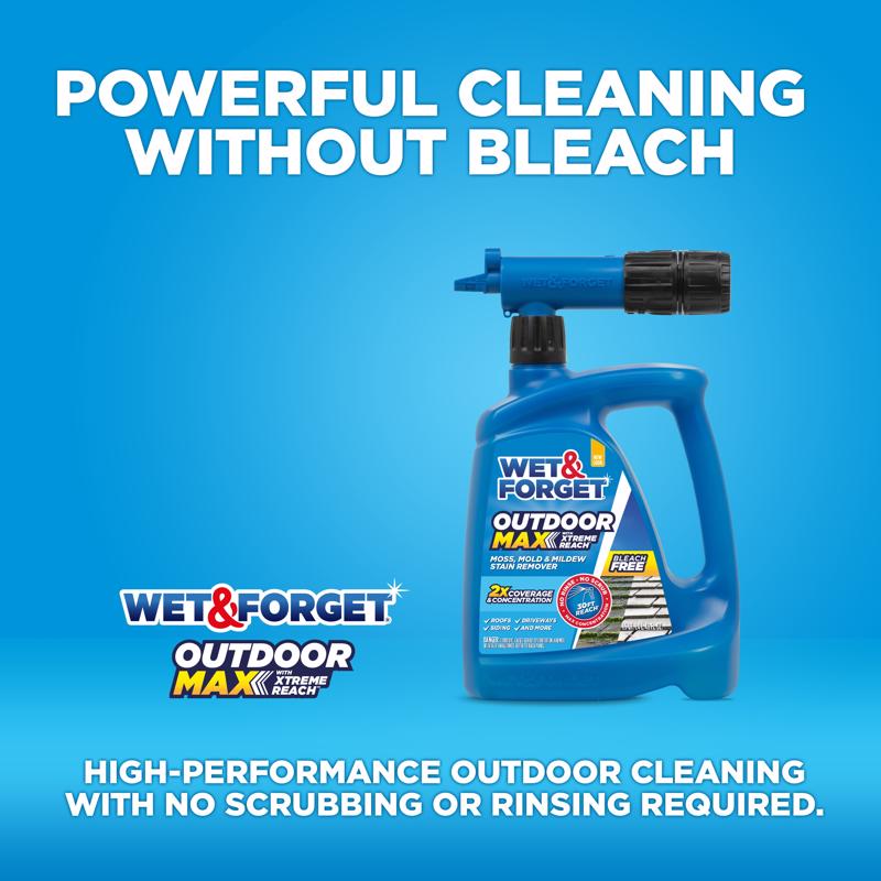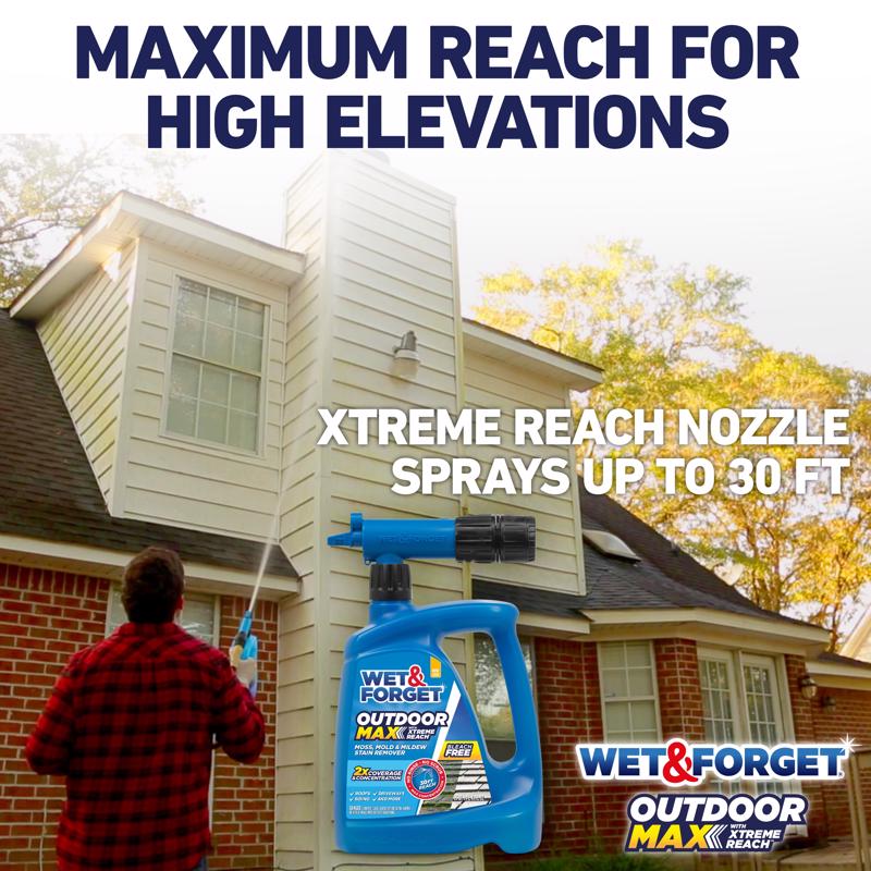 The new wet & forget hose end makes outdoor cleaning quick and easy. the much-awaited hose end was designed with a proprietary nozzle for higher reach and more coverage per bottle. it attaches directly to your hose and sprays up to 30 ft. allowing you to clean hard-to-reach areas. treat an entire house, roof, driveway or deck in minutes. simply spray it on and forget it.