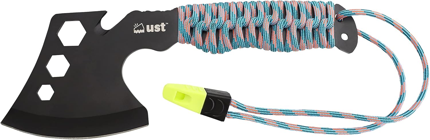 The UST ParaHatchet is a versatile outdoor tool built from tough 4mm stainless steel, ideal for chopping firewood, clearing limbs, and tackling camp tasks. A black oxide finish helps protect the blade from rust, while integrated multi-size hex wrenches (3/8", 9/16", 11/16") add utility without compromising safety, even with the sheath in place. The paracord-wrapped handle provides a secure grip in any weather and unwraps to reveal about 8 feet of ParaTinder cord, complete with a red tinder thread for easy fire starting using the included flint. Additional features include a quick-action rope cutter, integrated whistle, and compact protective sheath, making the ParaHatchet a lightweight, all-in-one survival companion.