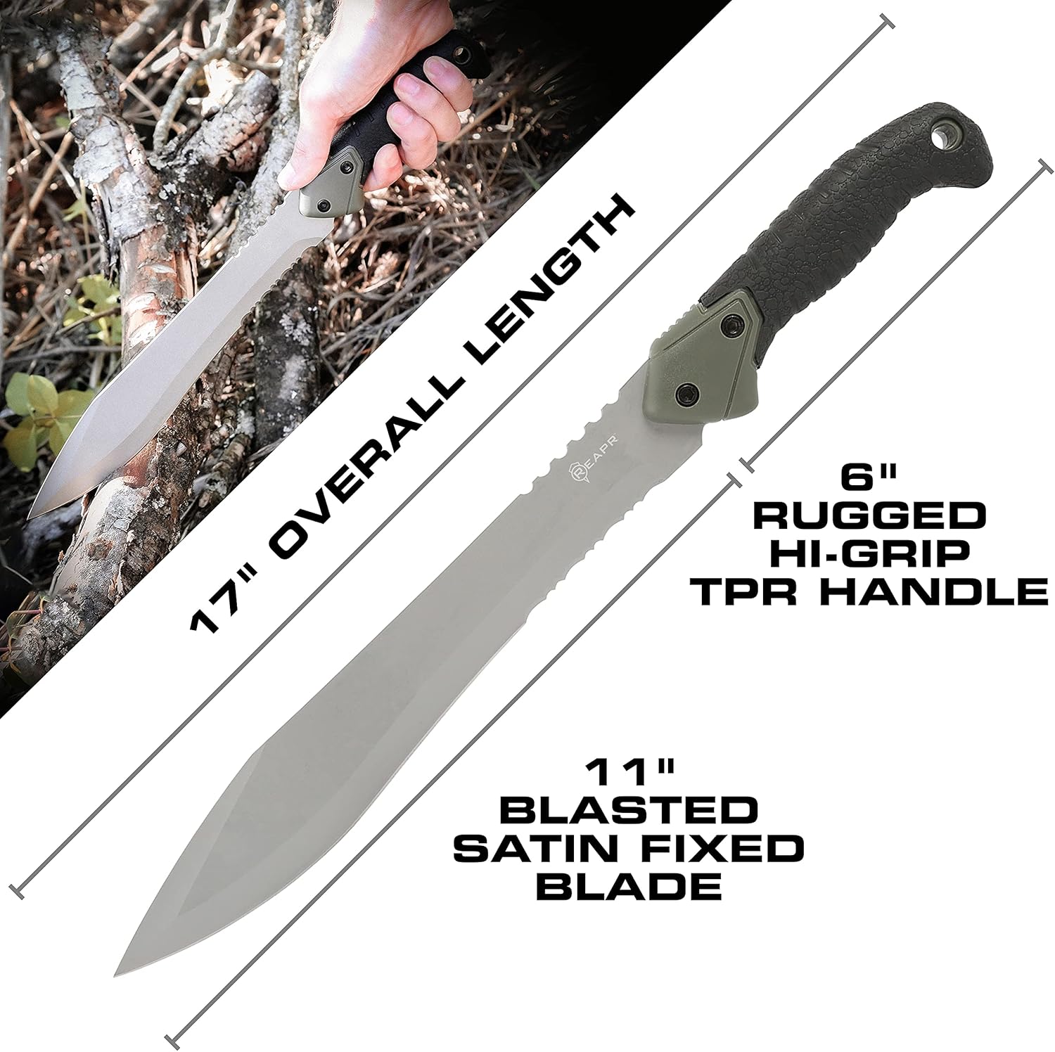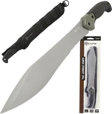 Conquer the wilderness with the REAPR Tac Jungle Knife, a versatile and durable fixed-blade knife designed for survival, hunting, and outdoor adventures. Featuring a rugged, heavy-duty blade, this knife is perfect for chopping, cutting, and slicing through dense vegetation, wood, and other tough materials. The ergonomic handle ensures a secure, comfortable grip, even in wet conditions. Built for durability and reliability, the REAPR Tac Jungle Knife is an essential tool for those who need dependable performance in extreme environments.