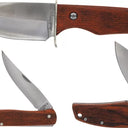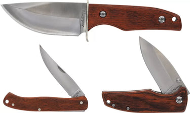 The Uncle Henry Fixed/Folder Set (BRK-SCHP1183286) offers exceptional value and versatility. This set pairs a dependable fixed blade knife with a classic folding knife, both featuring durable Staglon handles and reliable stainless steel blades. Perfect for everyday carry or outdoor adventures, these knives are designed for comfortable grip and lasting performance. The fixed blade comes with a sturdy sheath for safe carry, while the folding knife boasts a secure lockback mechanism. This Uncle Henry set provides a quality cutting solution you can trust. Uncle Henry. Satin finish stainless blade. Brown wood handle. Includes: 7.5" overall fixed blade with 3.5" drop point blade; 3.5" closed linerlock with 2.5" blade; 3.75" folder with 2.75" blade; Gift tin. Clam packed.