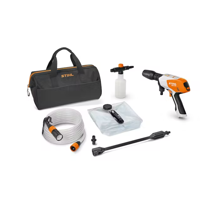 The RCA 20 is a battery-powered cleaner ideal for light jobs from cleaning tires to watering plants. The 4-in-1 nozzle easily switches between flat, point, rotary, and shower settings for a variety of applications, and ECO mode helps users get the most out of their battery charge while reducing pressure for delicate applications. Included with the cleaner is a siphon hose, one-gallon water bag, detergent sprayer, and spray lance, giving the RCA 20 the ability to draw water from multiple sources. The lightweight and compact design and the handy storage bag make this washer easy to take with you to the backyard or on the road.
