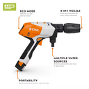 - 4-in-1 nozzle easily switches between flat, point, rotary, & shower settings