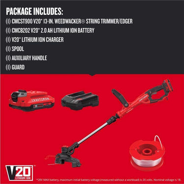 V20 13-in. Weedwacker string trimmer/edger features a high efficiency motor and is equipped with a 2.0 ah battery allowing you to take on the tasks at hand. once the task is complete, conveniently store using the integrated versa track hook with the versa track system sold separately. the V20 battery platform is compatible with Craftsman v20 outdoor equipment and power tools. you’ll find the complete line of outdoor tools and equipment essentials for a job to make you proud.