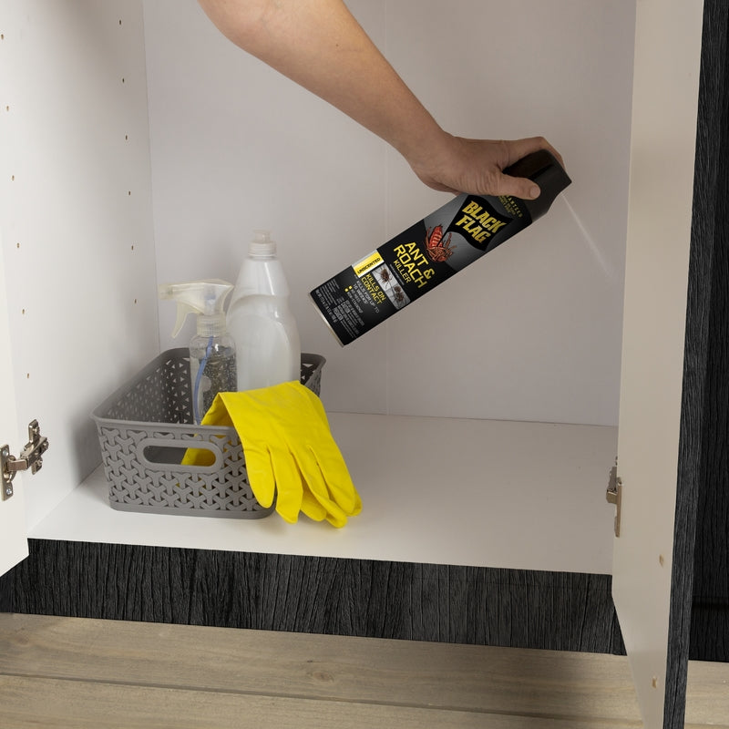 Black Flag Ant & Roach Killer controls roaches, ants, crickets, fleas, silverfish, spiders and other listed insects indoors on contact with an unscented, no-mess formula. Keeps controlling roaches, ants (excluding pharaoh and fire), silverfish and crickets for up to 16 weeks. Spiders (like black widow and wolf spiders) must be sprayed directly to be killed. Use along and behind baseboards; beneath and behind sinks, stoves, refrigerators and cabinets; around plumbing and other utility installations; around waste containers and wherever else these pests may find entrance. Use along and behind baseboards, appliances, sinks, pipes and plumbing. When treating for ants, spray around door and window frames, other entry points and trails.