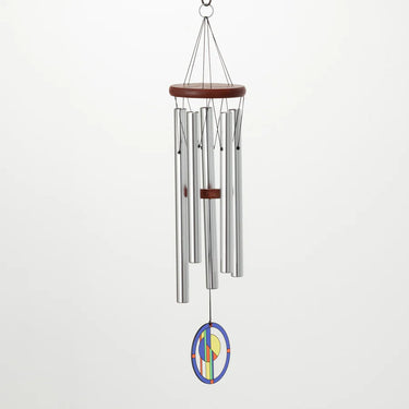 Tuned to a pentatonic scale, a sound commonly used in Asian music and American folk songs, this chime delivers a soothing, harmonious tone. It is adorned with a colorful stained-glass-effect wind catcher, drawing inspiration from the Art Deco and Bauhaus movements.