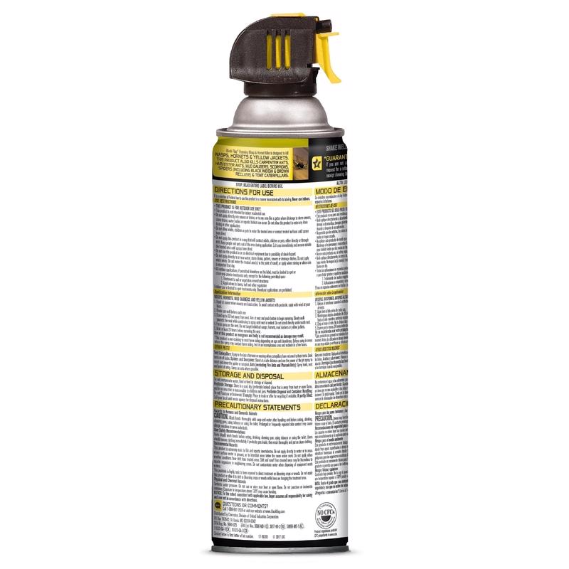Black Flag Foaming Wasp & Hornet Killer aerosol spray delivers a blanketing foam to kill wasps, hornets and yellow jackets by contact. Also use it to control carpenter ants, harvester ants mud daubers, scorpions, spiders (including black widow and brown recluse) and tent caterpillars. The foaming jet spray shoots a powerful stream up 20 feet for fast knockdown, so you can treat nests above ground from a distance. To control stinging insects, apply to the nest outdoors at sunset, when insects are least active. Spray with the wind at your back. Stand up to 20 feet away from the nest, then aim and begin spraying while slowly walking toward the nest. Treat until the nest is soaked. Wait at least 24 hours before removing the nest.