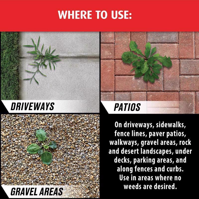 • Use this weed control product where no plant growth is wanted for at least a year on driveways, sidewalks, fence lines, paver patios, walkways, gravel areas and parking areas