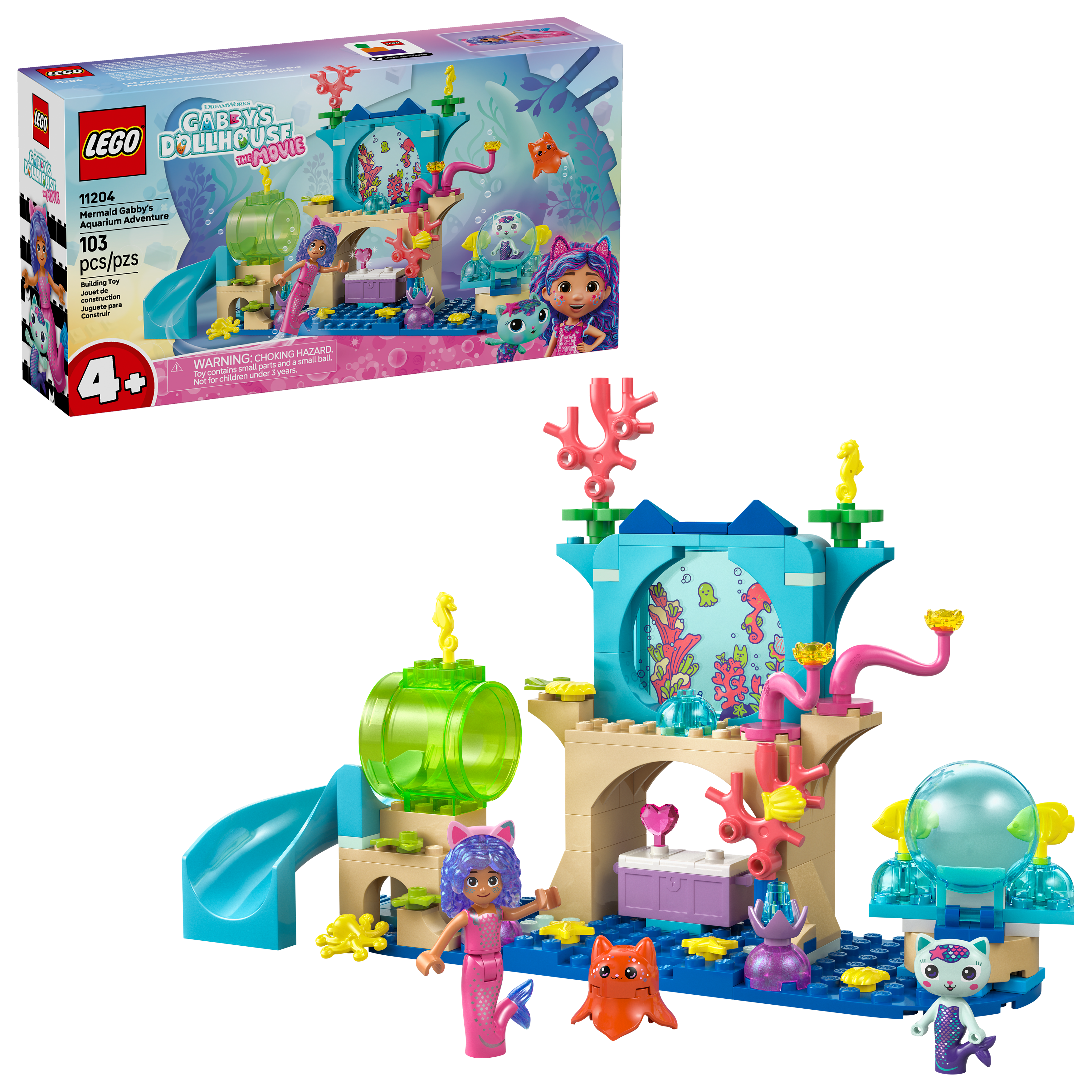 Dive into underwater magic with the LEGO Gabby's Dollhouse Mermaid Gabby's Aquarium Adventure (11204) building set, where preschoolers ages 4 and up can explore colorful sea adventures with their favorite characters. This vibrant building set brings the excitement of DreamWorks Animation's Gabby's Dollhouse: The Movie to life through hands-on building and imaginative pretend play. Little builders can join the Gabby minidoll in her beautiful mermaid outfit alongside the MerCat and Jellyfish figures for underwater exploration filled with discovery and wonder. The aquarium environment features interactive elements including a fun slide, a floating bubble chamber where MerCat can swim, and movable coral that reveals a hidden treasure chest surprise. Parents can enjoy building together with their preschoolers using the large Starter Brick and easy-to-follow pictorial instructions that make construction quick and rewarding. Each bag contains one complete buildable model, letting children experience immediate success and maintaining their engagement throughout the building process. This building toy encourages creativity and storytelling in children as they recreate movie scenes or invent their own aquatic adventures with Gabby and friends. Makes a perfect for young builders who love sea creatures, underwater exploration, and Gabby's colorful adventures. Contains 103 pieces.