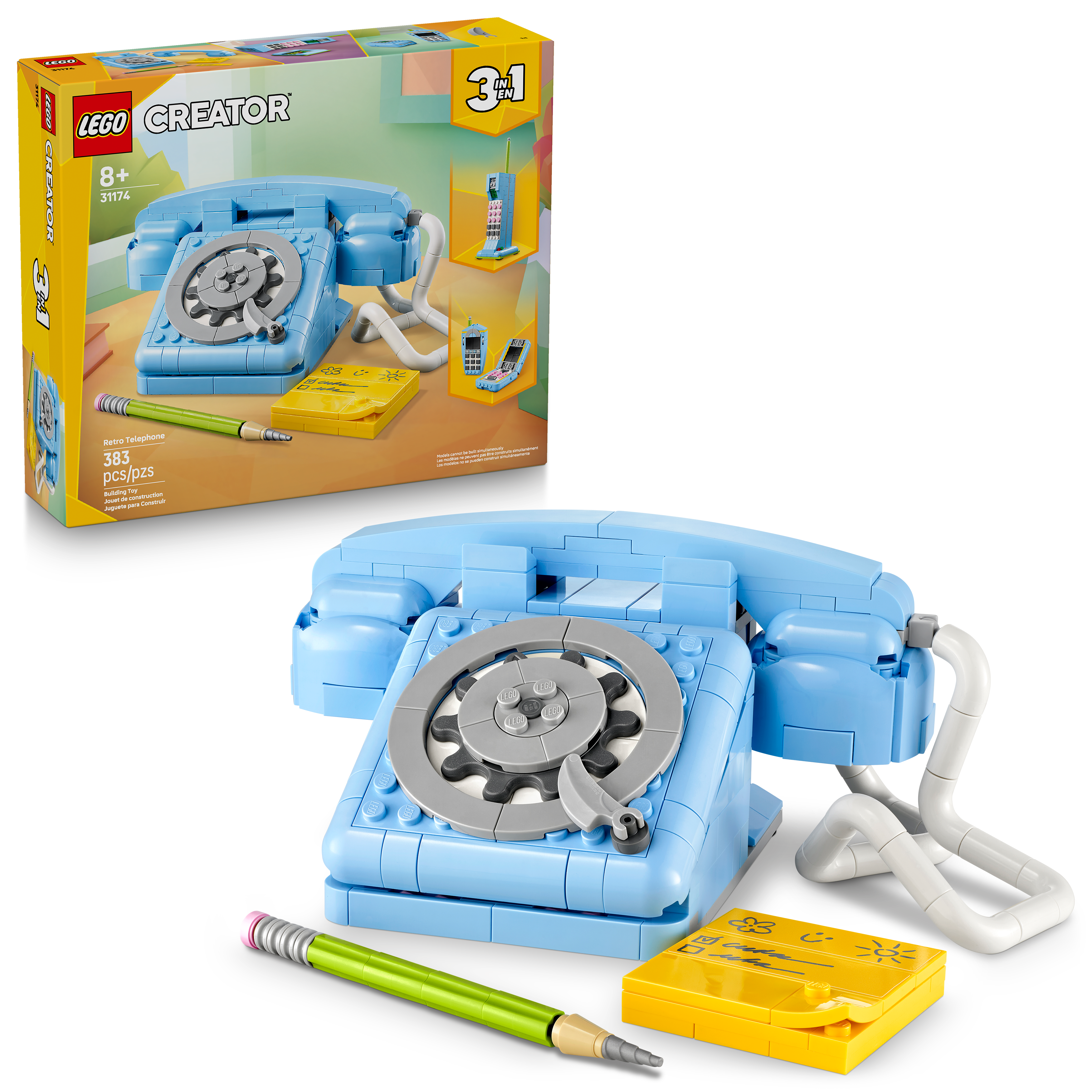 • 3 retro phone playset building options in 1 box – The LEGO® Creator 3in1 Retro Telephone lets kids aged 8 and up build and rebuild 3 different retro-style model sets with the same bricks