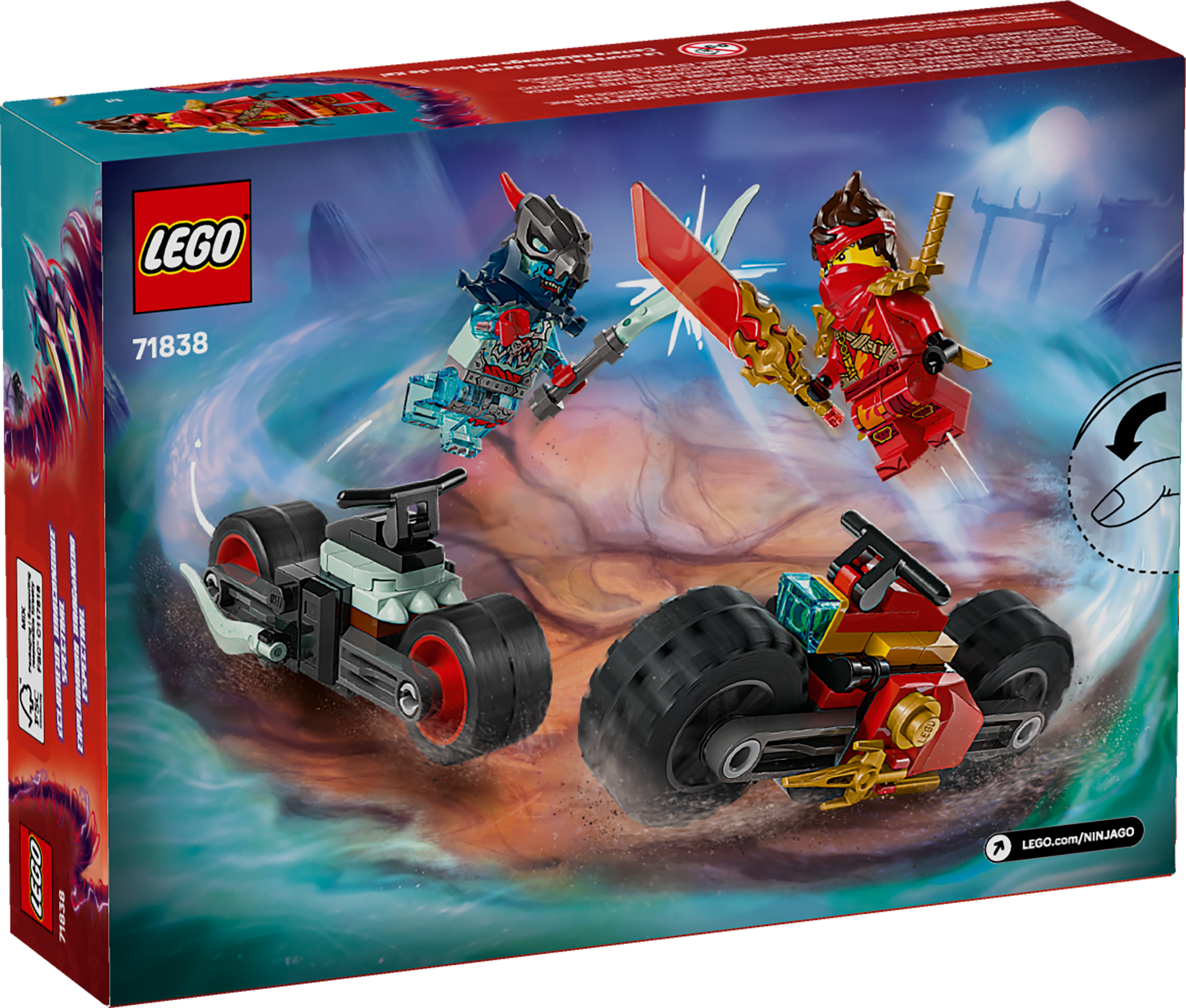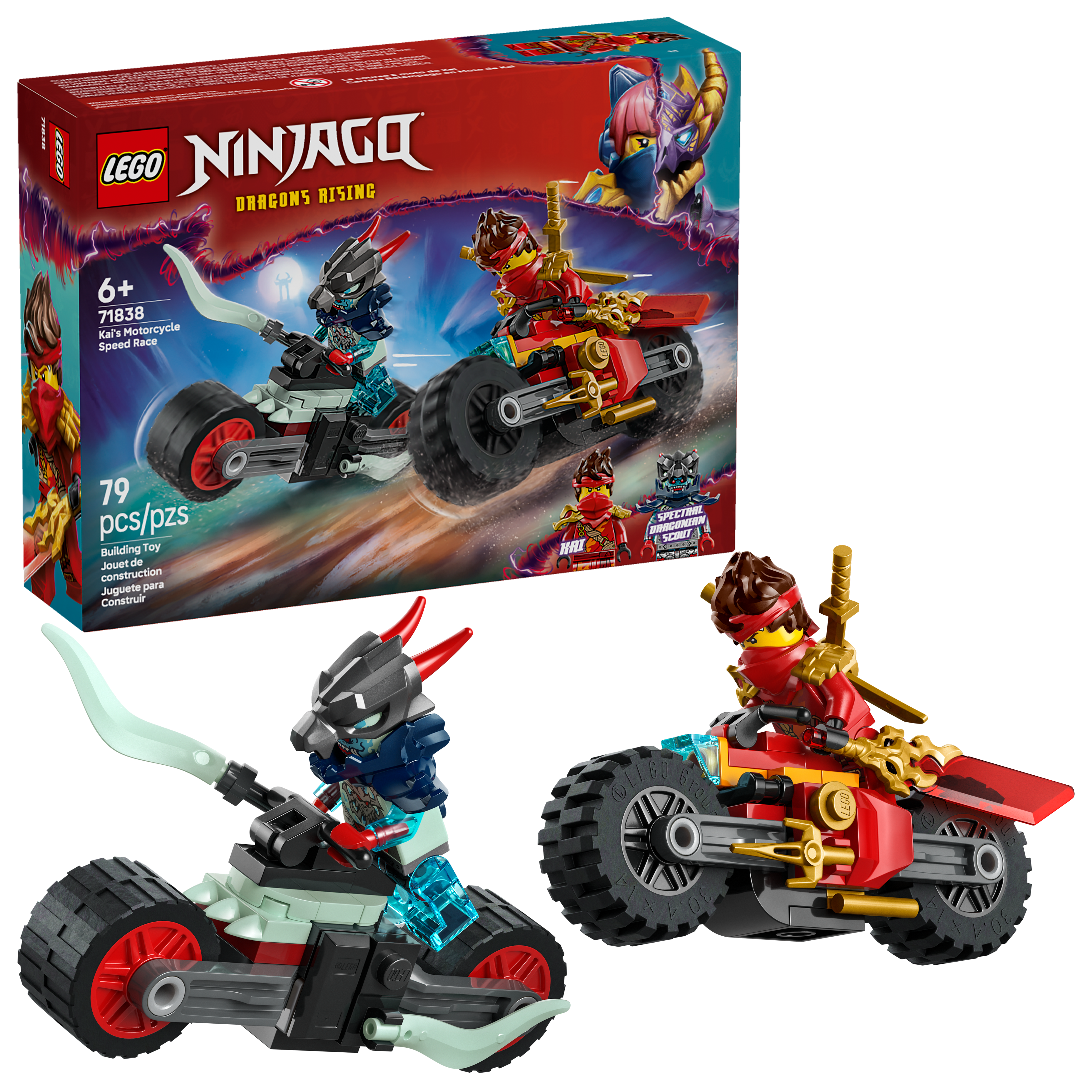 The LEGO NINJAGO Kai's Motorcycle Speed Race (71838) set puts builders 6 years old and up in the driver's seat for Kai's most thrilling chase yet! Fans of the hit TV show will love staging epic good-versus-evil chases from the world of NINJAGO Dragons Rising Season 3. Builders can command the Kai minifigure in his flame-powered race bike, complete with dual golden daggers, as he faces off against the Spectral Dragonian Scout minifigure and his ghostly demon bike. Kai's translucent reveal blade and twin golden katana swords help protect him as the rival riders tear through imaginary landscapes, wheels spinning and accessories gleaming. Perfect for solo adventures or building with friends, this building set makes an ideal birthday or holiday gift for NINJAGO fans and kids who love building challenges. Combines with other sets in the LEGO NINJAGO collection (each set sold separately) for expanded play possibilities. The LEGO Builder app guides young builders through intuitive step-by-step instructions with helpful 3D viewing tools. Contains 79 pieces.