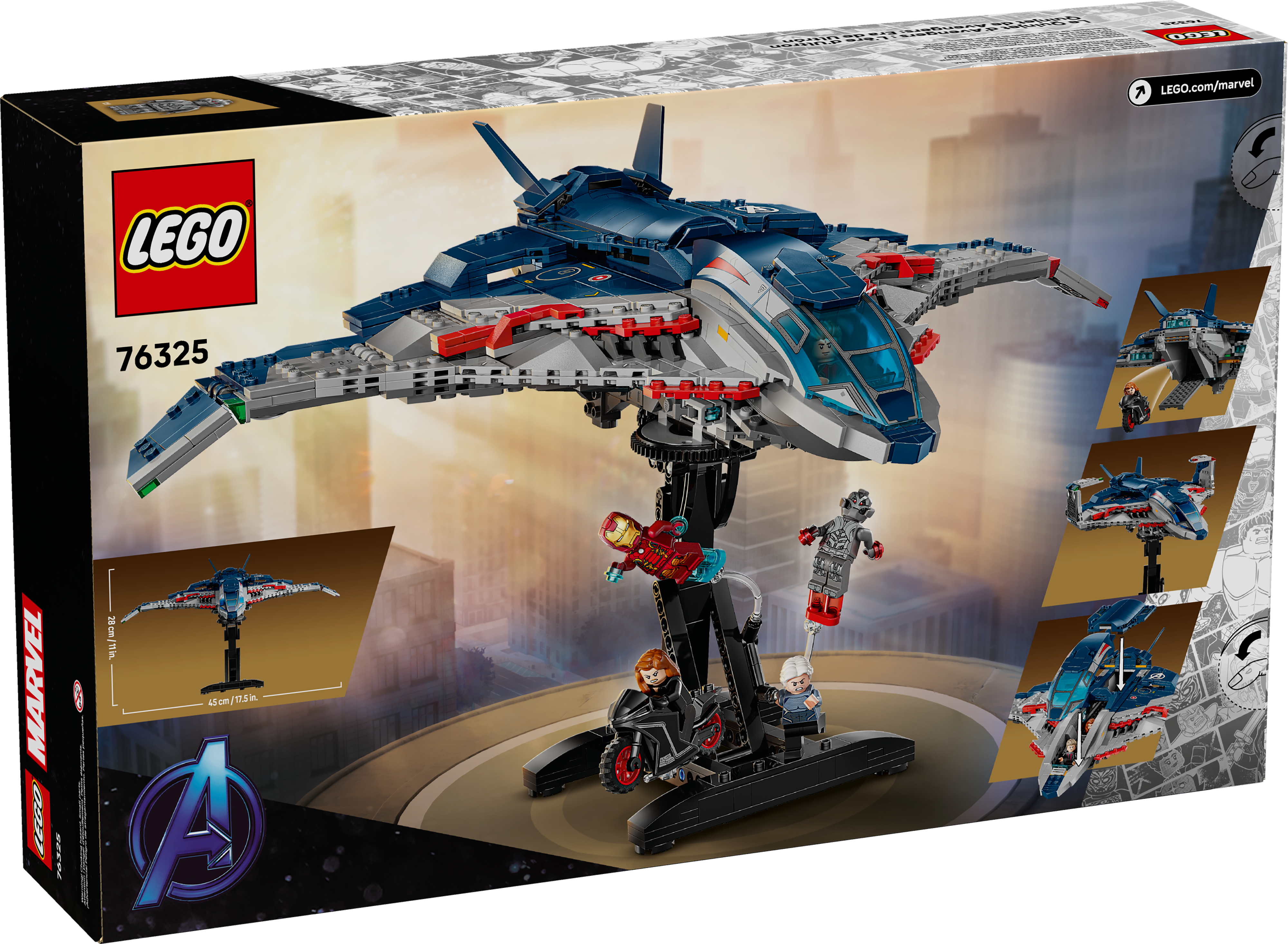 • 1,131-piece kids’ building kit – The Quinjet on its stand measures over 11 in. (28 cm) high, 12 in. (30 cm) long and 17.5 in. (45 cm) wide