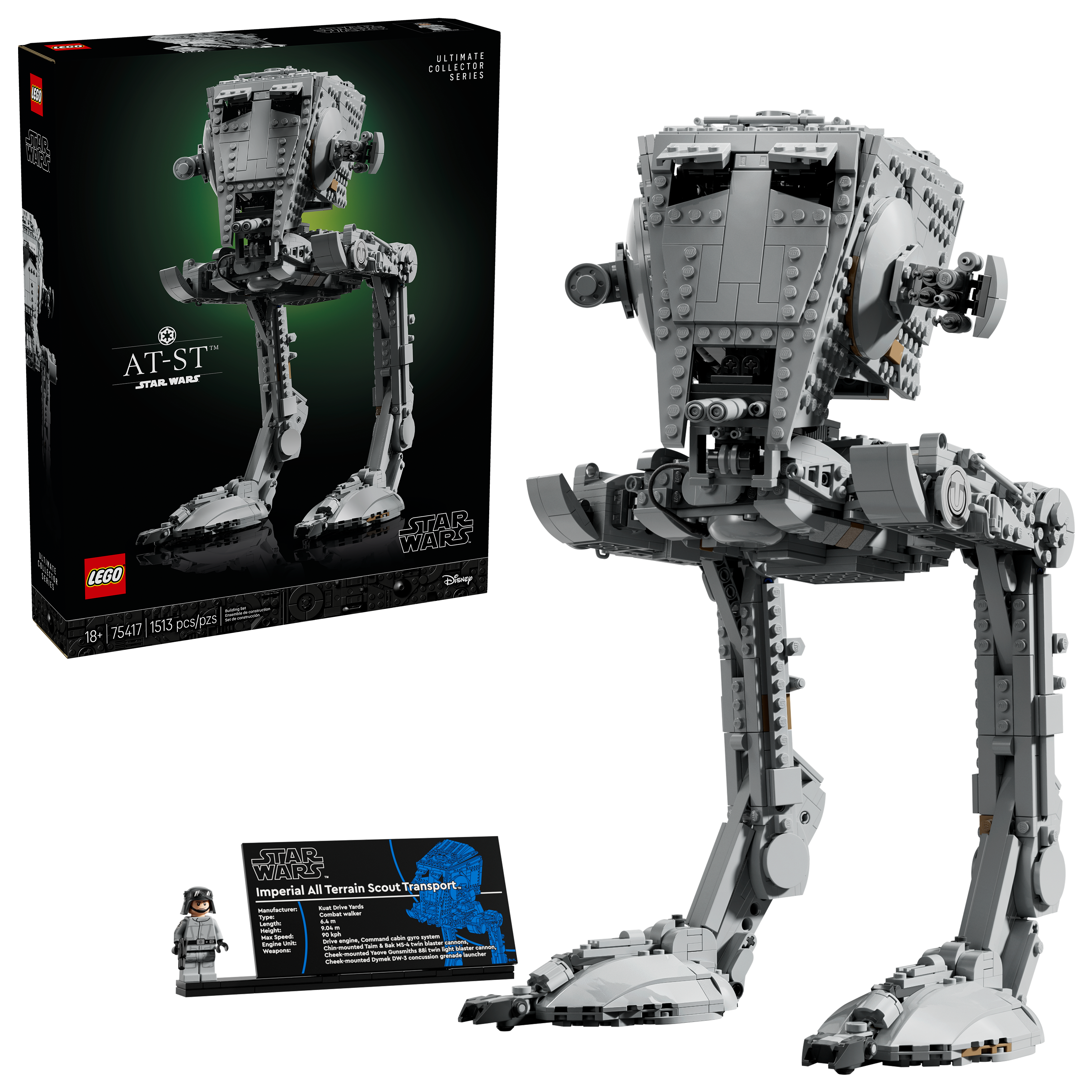 • Build-and-display model – Display your creation next to the AT-ST information plaque and unique AT-ST Driver LEGO® Star Wars™ minifigure with the Imperial crest on its arms and a blaster pistol