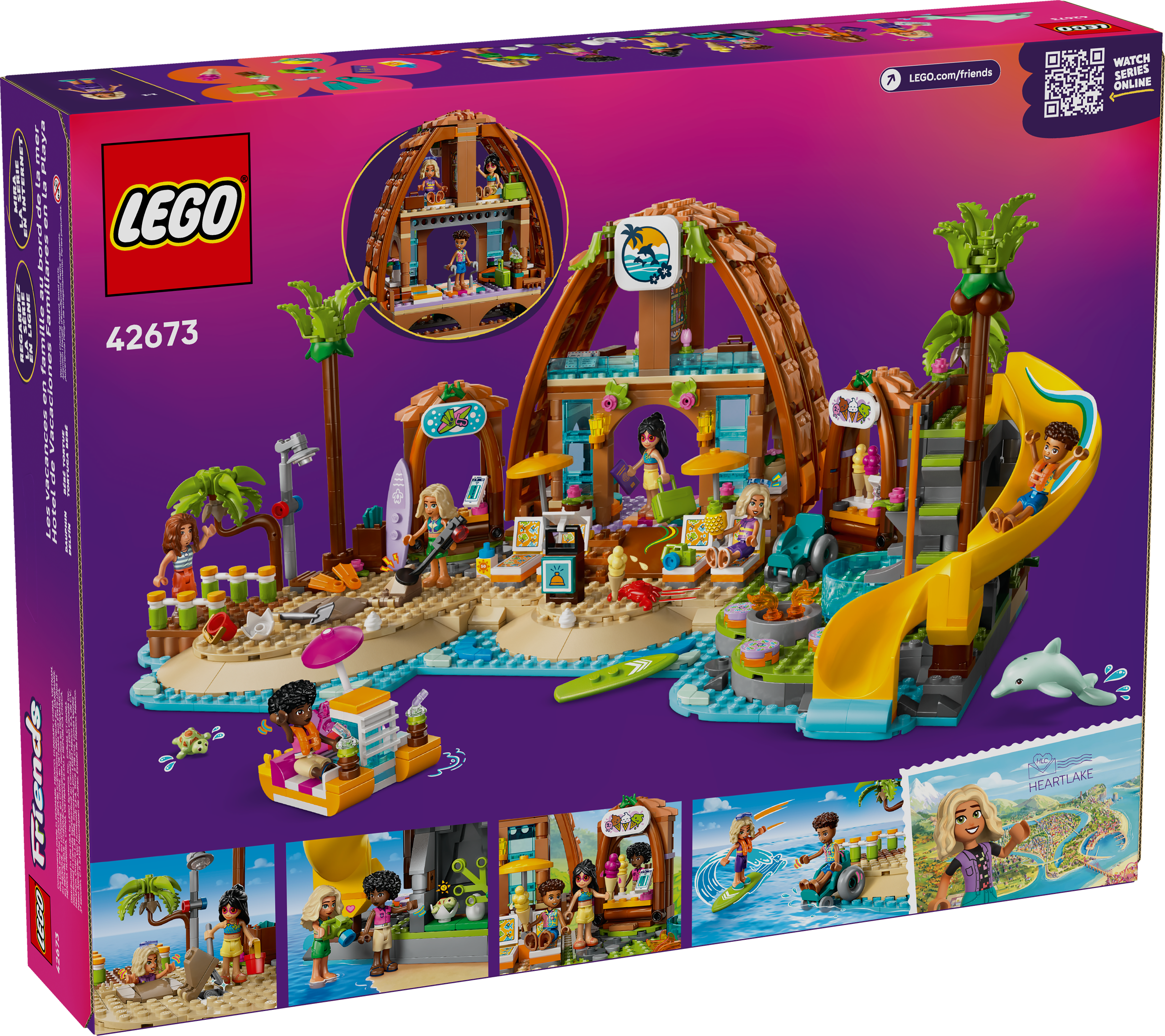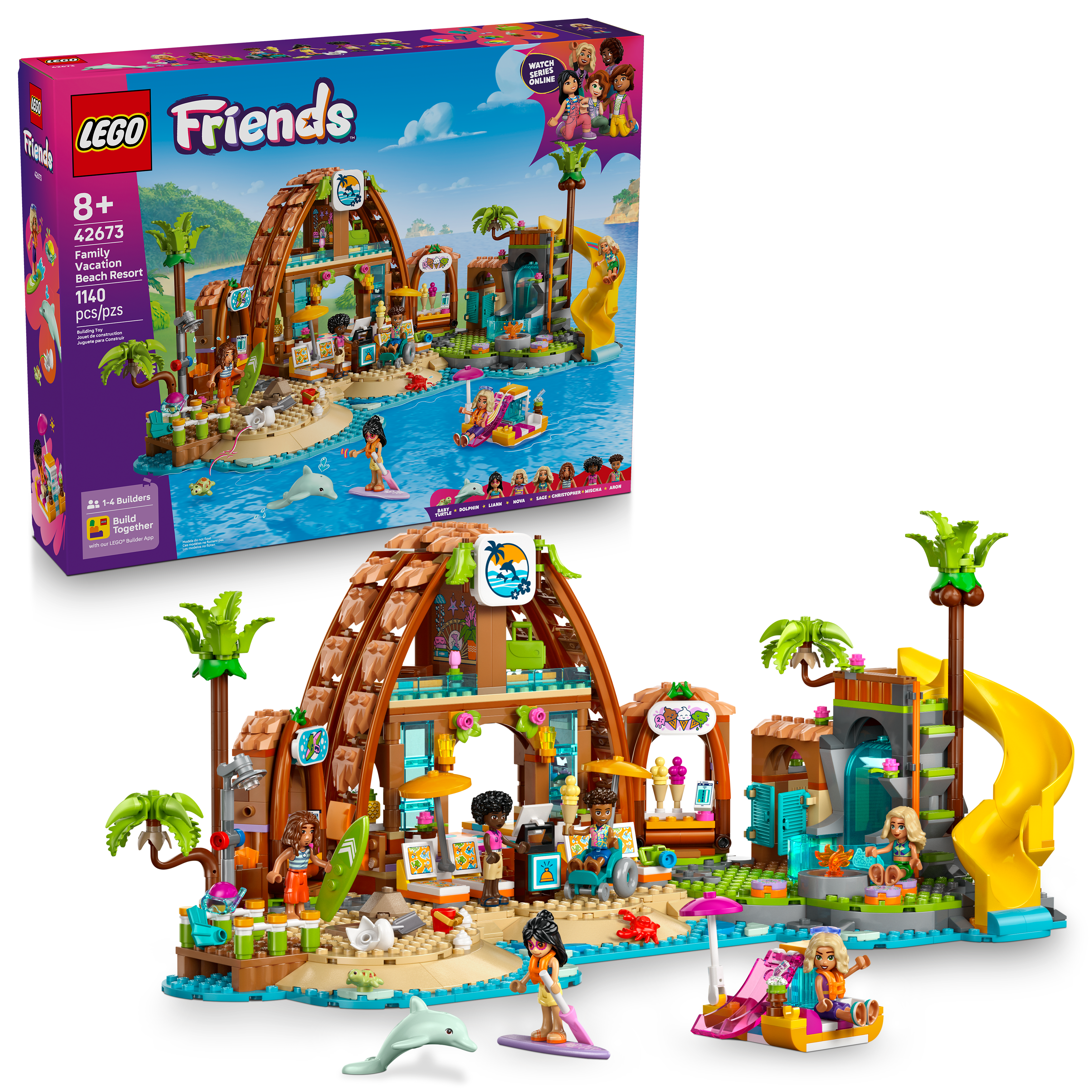 Enjoy family fun, vacation style with this action-packed kids’ building set toy for girls and boys aged 8 years old and up. The LEGO® Friends Family Vacation Beach Resort (42673) is full of stories and includes 6 LEGO Friends minidolls, a dolphin and a turtle figure, plus accessories for creative play. Build the resort, then create exciting adventures with the many beach activities and watersports packed inside. Find a coin using the metal detector accessory, then bury a character in the sand for classic beach family fun! Explore the rental shop with its fins, snorkels and surfboards. Find the turtle’s hidden cave, then try out the slide or visit the ice cream stand before relaxing by the firepit. The storytelling continues inside where there’s a bedroom and bathroom. Discover more creative toys (sold separately) in the LEGO Friends universe. Build Together with friends and family – the LEGO Builder app offers a fun and collaborative experience when building this set.