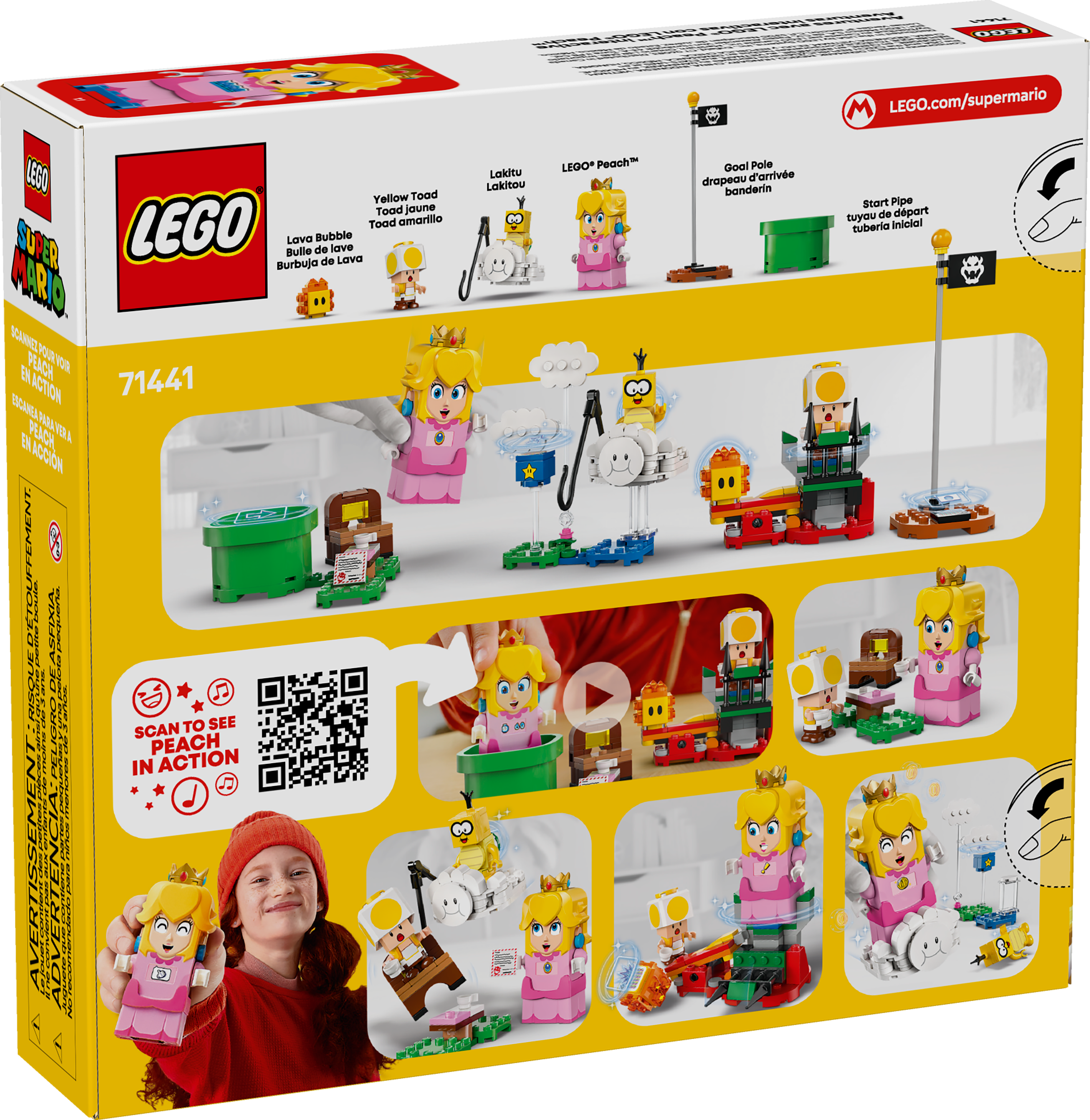 - 4 LEGO® Super Mario™ figures – This Nintendo® LEGO set includes an interactive LEGO® Peach™ princess toy figure, plus Lakitu, a Yellow Toad and a Lava Bubble