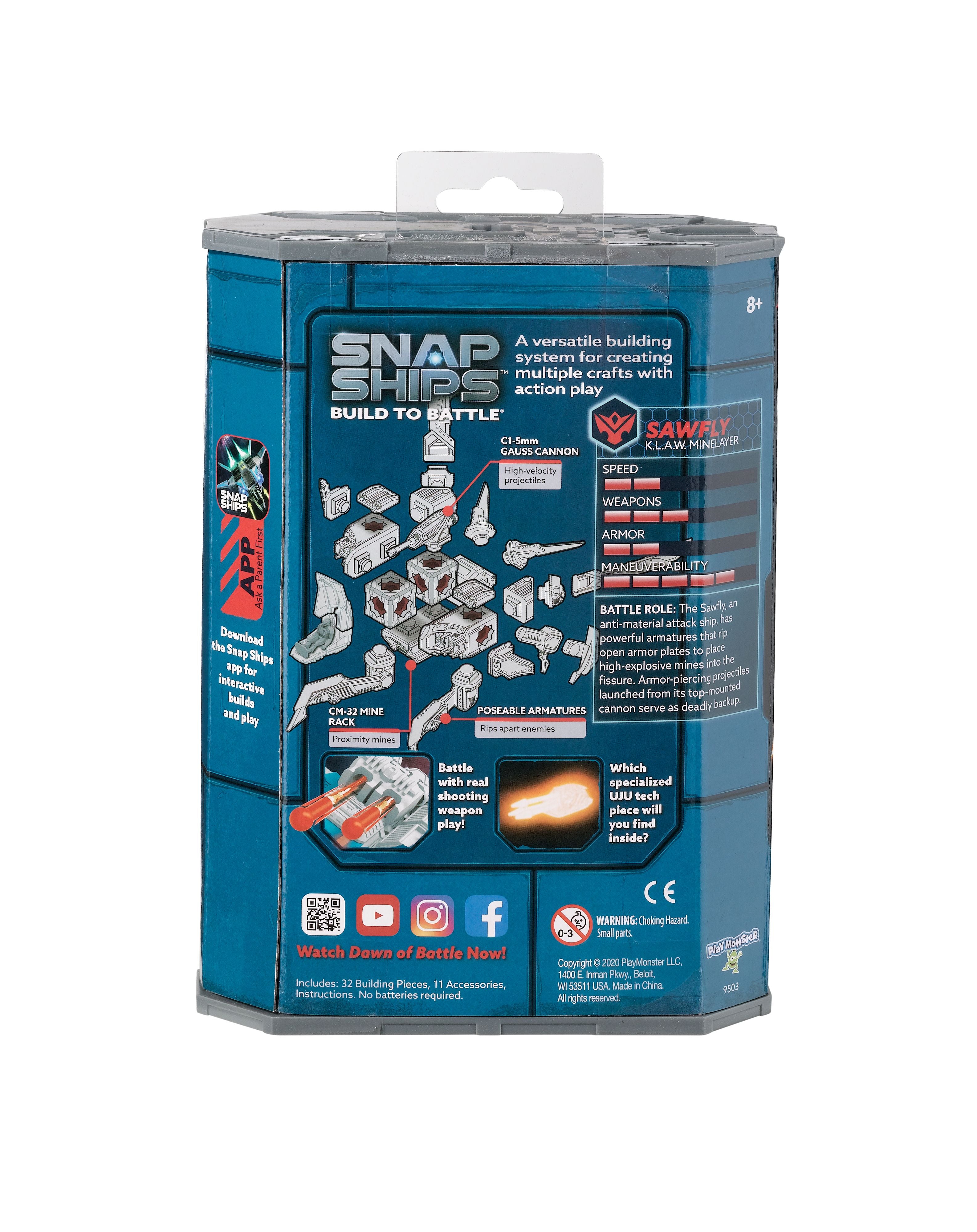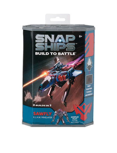 The Snap Ships set for Sawfly includes instruction for two different builds that you assemble yourself and then engage in battle with real shooting weapon play! Sawfly K.L.A.W. Minelayer, flown by a Komplex pilot, is an anti-material attack ship that launches armor-piercing projectiles. Add the mysterious UJU tech piece that’s included, and the destruction only amplifies!