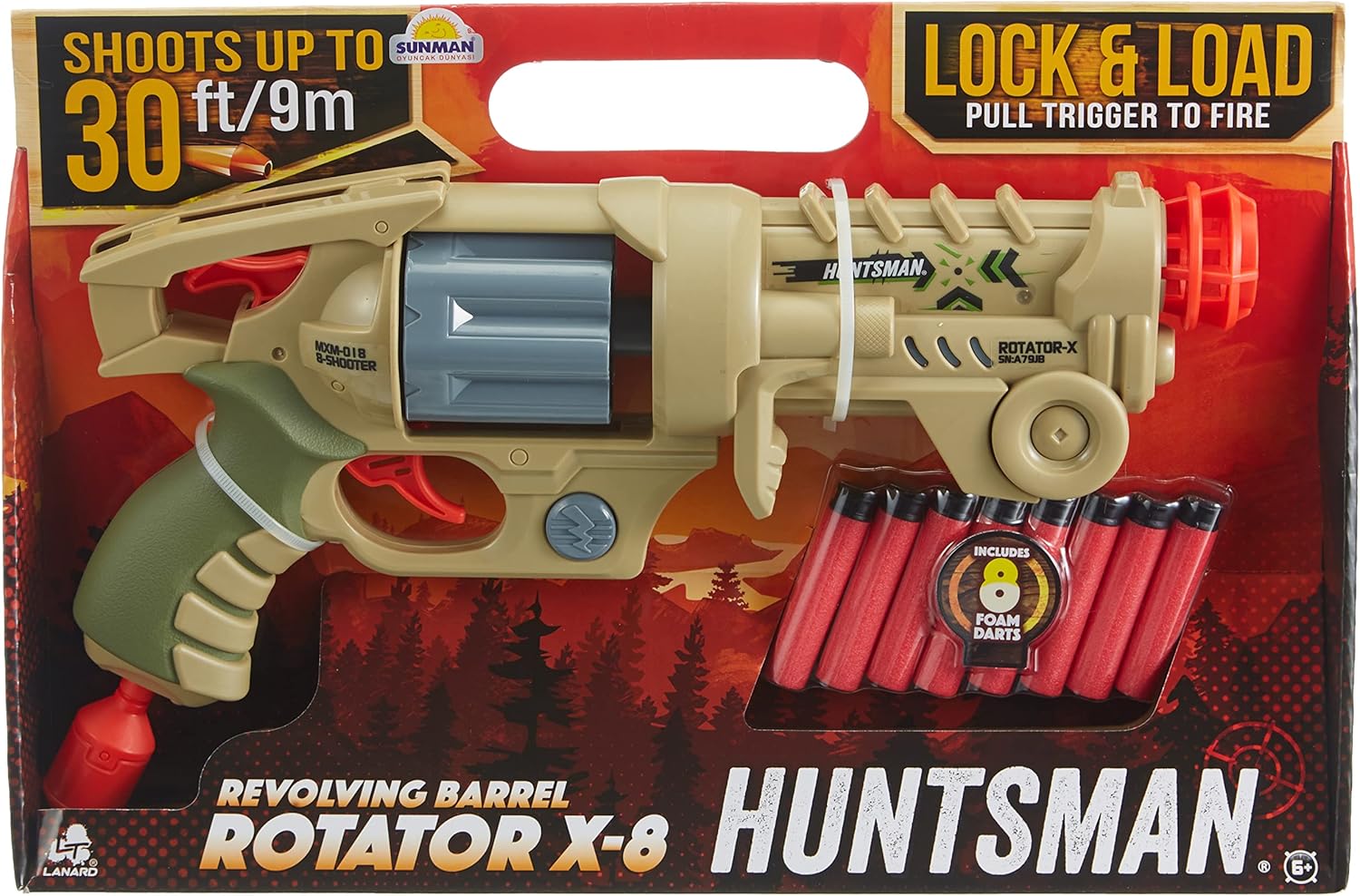 Huntsman Rotator X-8 Foam Dart Gun. Includes eight foam darts Shoots up to 30ft/9m. Pull down and lock and load the Revolving barrel.