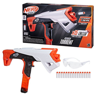 The durable, quick-release magazine is compact and lightweight for convenient portability. The blaster fires darts at a velocity of up to 150 feet per second with pump action priming. The priming mechanism allows you to grip it on either the top or bottom for comfortable operation. Includes removable stock and trigger lock. The magazine and darts are compatible with Nerf Pro blasters. They are not compatible with Nerf Pro Stryfe X blaster and Nerf Pro AccuStrike half-length dart magazines.