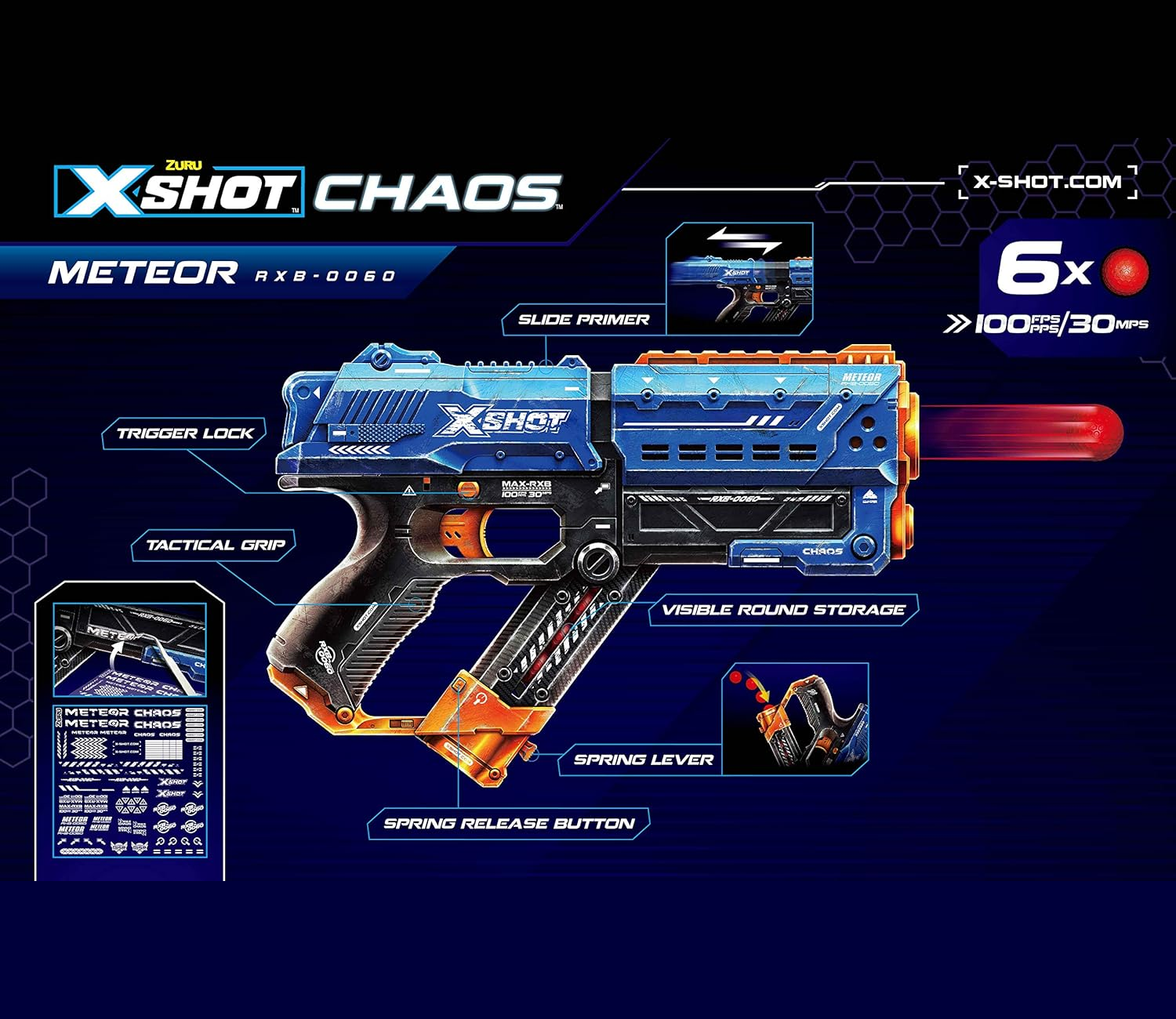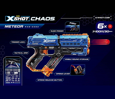 - HIGH-QUALITY DESIGN: The X-Shot Chaos Meteor holds 6 rounds, has a slide primer and performs with ubeatable accuracy!