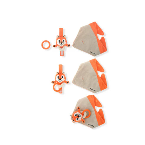 The removable and wearable plush sensory toy holds baby's pacifier (any with handle) or teether. It provides baby convenient access to their pacifier or teether while having fun interacting with their soft, cuddly buddy. The soother/teether holding buddy can be removed and used separately from bib (affixed to stroller, car seat strap or wrist etc.). The soft fabric bib with water resistant layer contains drool and keeps clothes dry and is reversible. Suggested age range is 3-12 months.