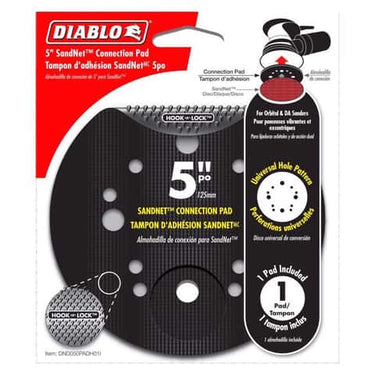 Diablo's SandNet connection pad allows users to effortlessly attach the Diablo SandNet disc to their random orbital sander. This easy-to-use connection pad is designed for a universal fit on all 5 and 8-hole sanders. The SandNet connection pad provides a barrier of protection between the SandNet disc and the sander's platform for less dust build up and longer sanding life. Use this connection pad on all grits of Diablo SandNet.