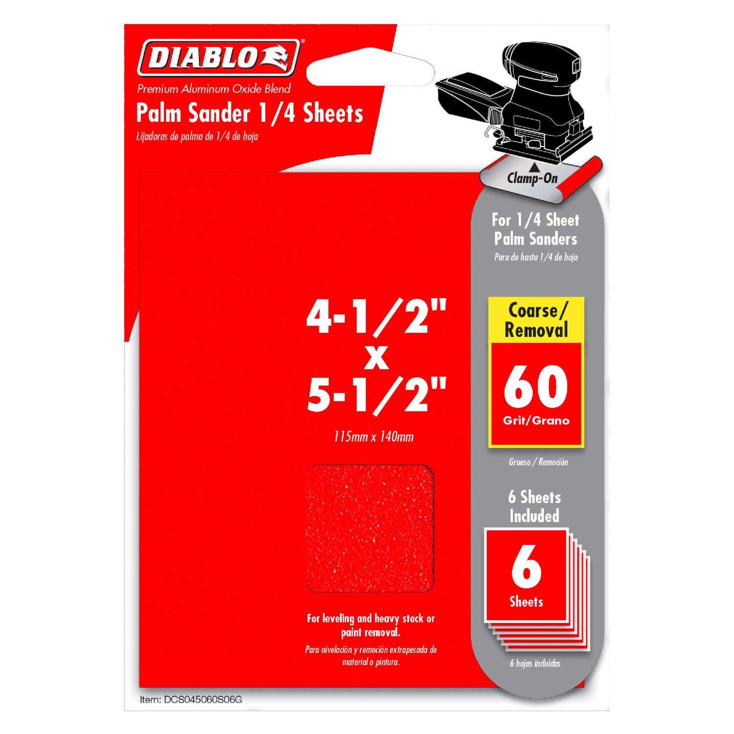 Diablo's premium 4-1/2 inch x 5-1/2 inch 60-Grit (Coarse) Clamp-on Sanding Sheets include break-through innovations that improve performance, extend sanding life and increase productivity. These sanding sheets are designed for use in 1/4 sheet palm sanders and are ideal for all types of wood, metal and plastics.