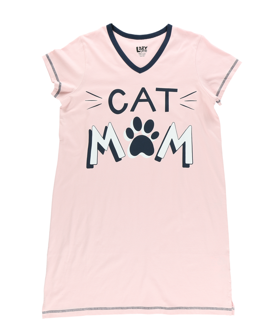 Every great Cat Mom deserves to be able to relax and be comfy. Relax in comfort with our Cat Mom women's V-neck nightshirt. This nightshirt features cute cat mom wording with a nice blue and light pink coloring. Any cat mom out there will love this nightshirt. Made with 100% combed cotton for maximum comfort and and stretch. This cute design is made with a contrasting neckband for a feminine look!