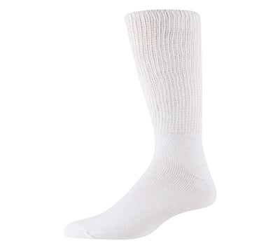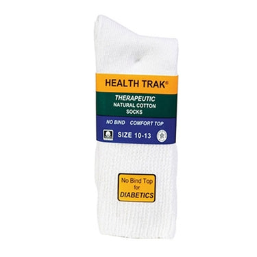 Railroad White Therapeutic Health Track Socks - 991-WH. 2 Pack Natural Cotton Therapeutic Sock. No bind comfort top for DIABETICS. The railroad men health track sock is perfect for Diabetics, individuals with sensitive feet, Edema, or issues with circulation in general. This sock has a non-bind top to ensure maximum comfort. Content: 95% Cotton, 3% Nylon 2% Elastic. Made In USA.