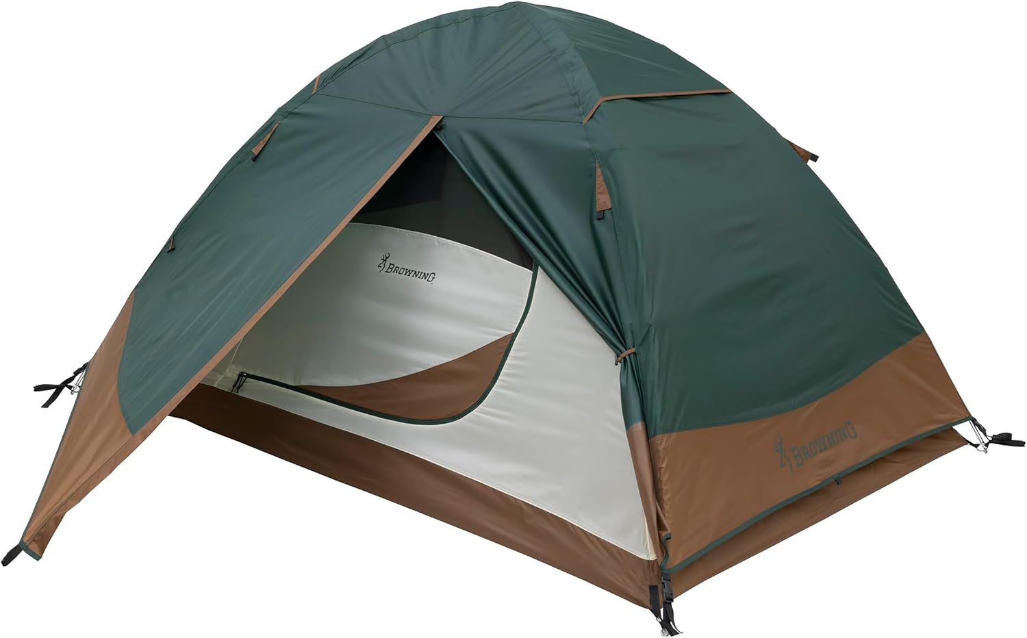 The Browning Camping Countryside Tent is a free-standing dome design, made with fiberglass poles. Pole clips quickly snap over poles for an easy to use and set-up camping tent. The weatherproof polyester rain fly has a 1500mm coating that protects from UV damage and securely buckles on for protection from weather. Factory-sealed fly and floor seams shield from the elements, and the poly taffeta floor has a heavier duty, 2000mm coating. Two doors for easy access and two vestibules provide space for gear storage and extended protection. Mesh storage pockets, gear loft, stakes, and guy ropes are all included.