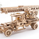 The UGEARS Fire Truck is equipped with the retractable 3-Section Fire Ladder on a rotating platform. Length when fully extended – 70cm. The Fire Ladder has several controls. Press the lever and lift up the ladder. Turn the platform to the right or to the left. Fix the selected position with a special ratchet. All three sections of the ladder are extending ahead. Ascend the ladder and you’ll get a real crane with hook at its end.