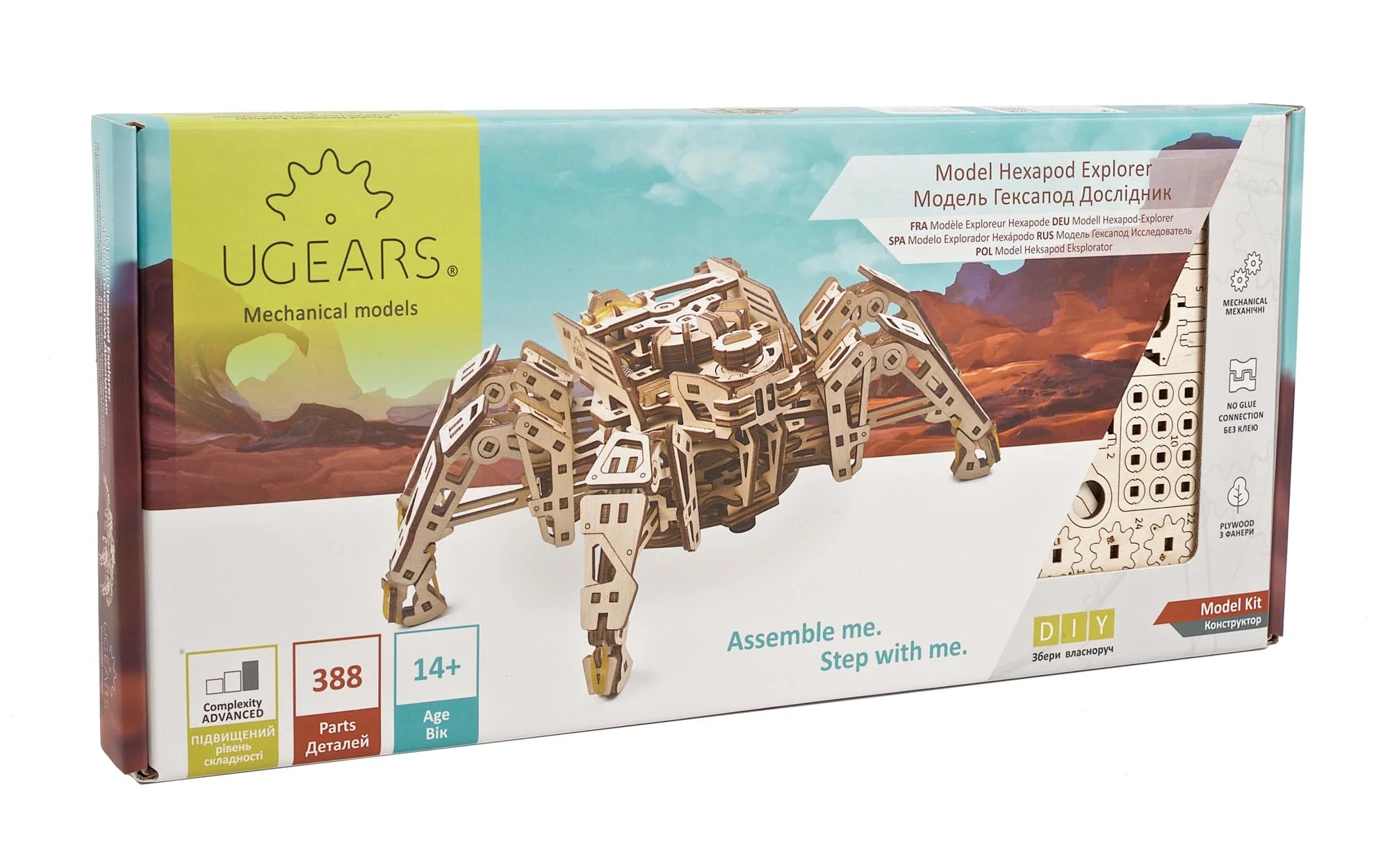 This DIY Hexapod Explorer takes its place as champion walker among Ugears' amazing family of mechanoids, automatons, 3D puzzles, and wooden mechanical marvels. We've created a purely mechanical, wooden walking robot, without electronic components. At Ugears we believe design should be elegant, in every sense of the word—simple, smart, and beautiful to look at.