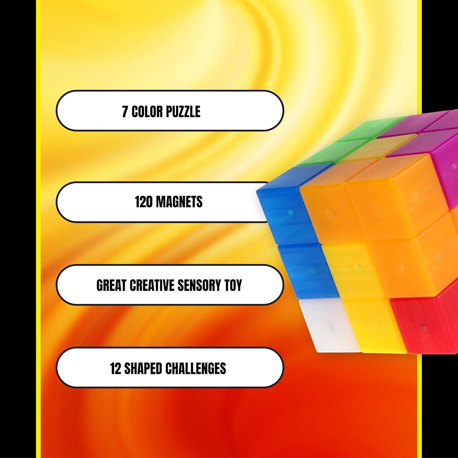 - 7-COLOR PUZZLE: Using 7 different colored block “bundles”, stack together to create shapes, or solve for a perfect cube