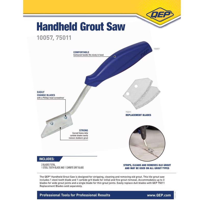 The QEP Handheld Grout Saw is designed for stripping, cleaning and removing old grout. This tile grout saw includes 1 steel tooth blade and 1 carbide grit blade for initial and fine grout removal. Easily replace dull blades with QEP 75011 Replacement Blades.