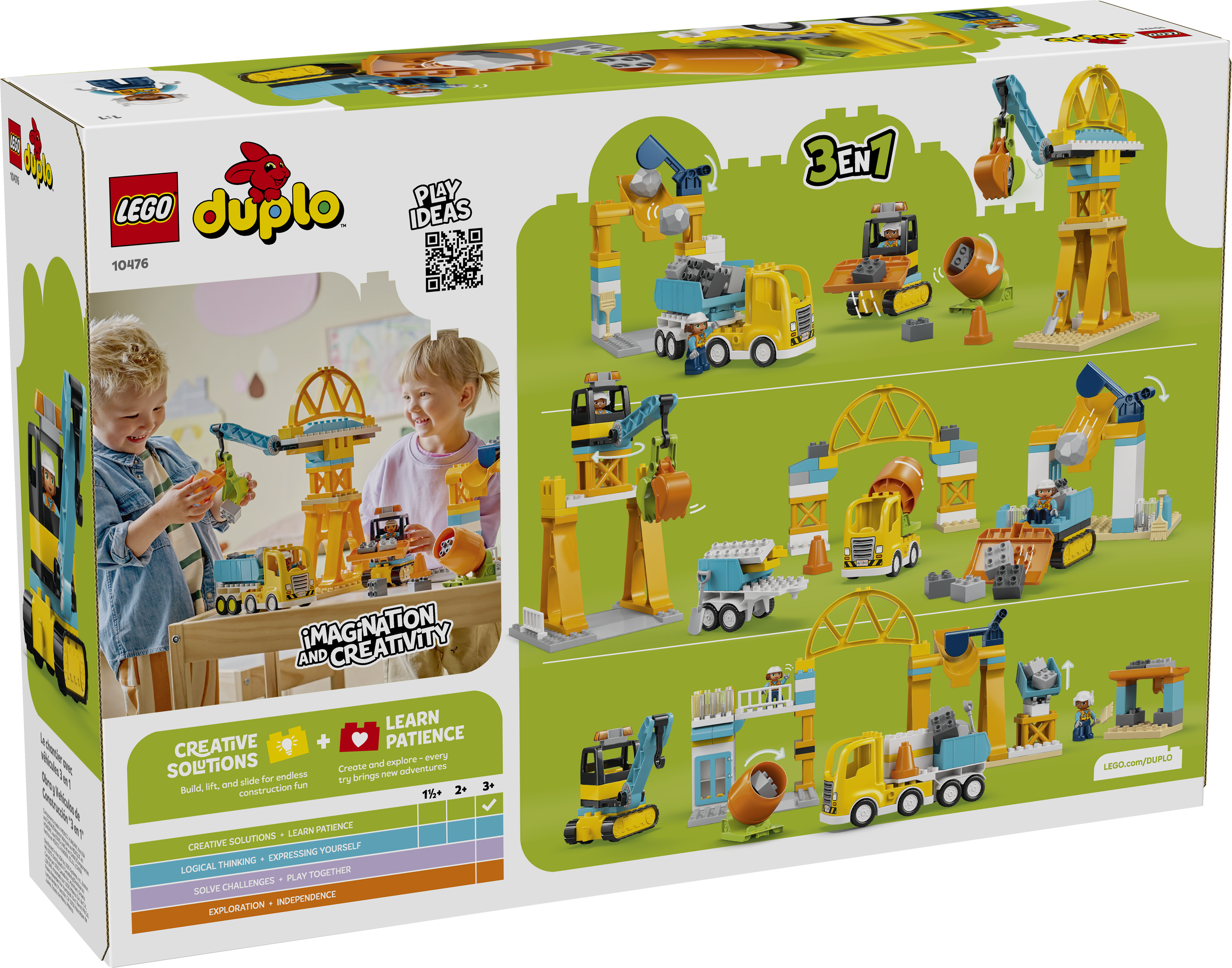 Introduce little builders to the 3 in 1 Construction Site and Vehicles (10476) toy where the building never stops! Toddlers ages 3+ immerse themselves in busy construction play as they load and unload the trucks, and pick up and move the boulders and the bricks with a range of LEGO® DUPLO® construction trucks.