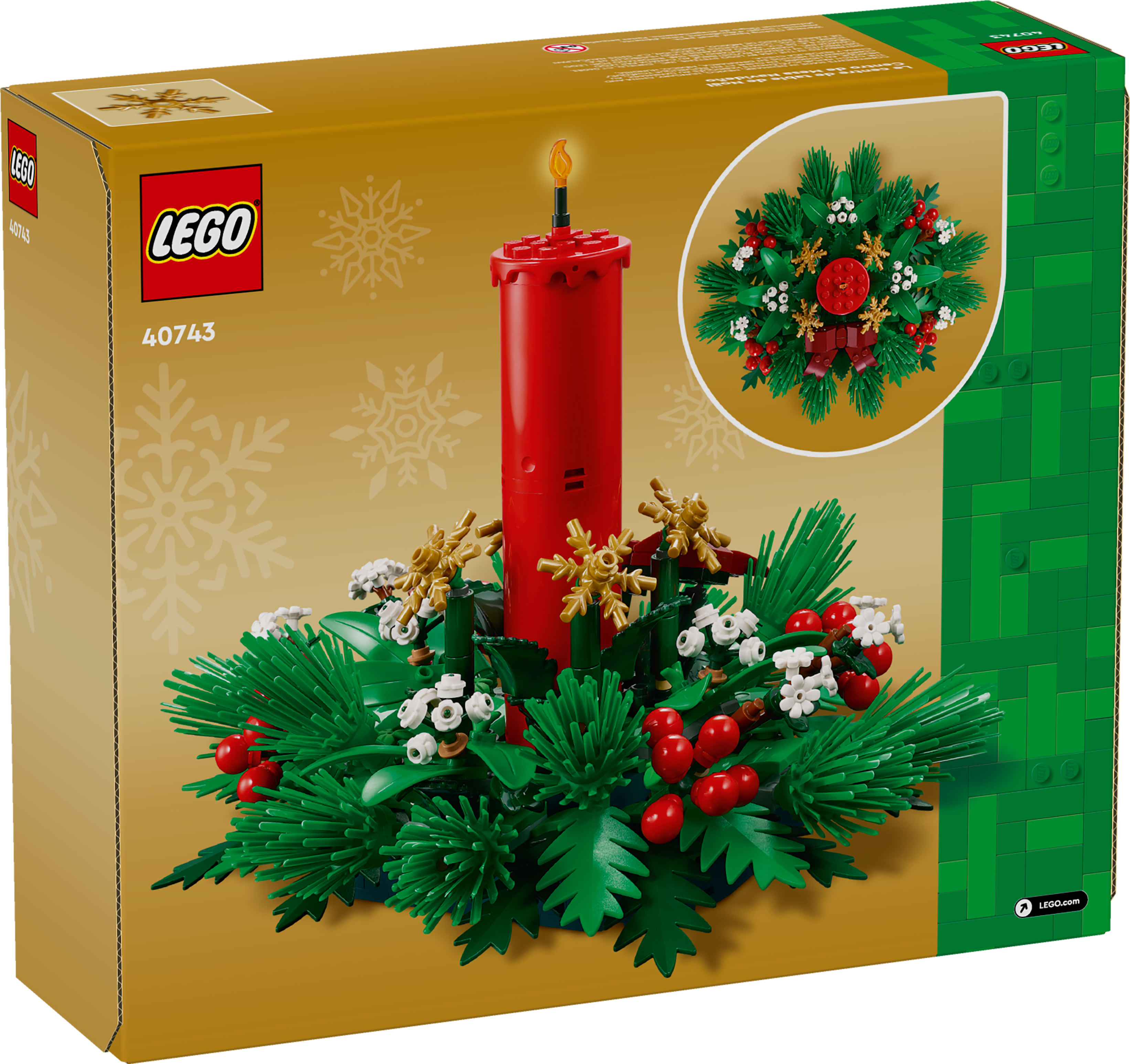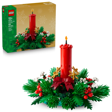 • Festive joy – The Christmas LEGO® set features a red candle at its center, surrounded by red berries, golden stars and green foliage