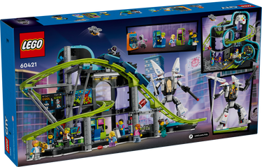 - A building toy packed with details for imaginative play – Features include a working 3-car roller-coaster train, a posable mech with a minifigure seat and toy arcade video gaming consoles