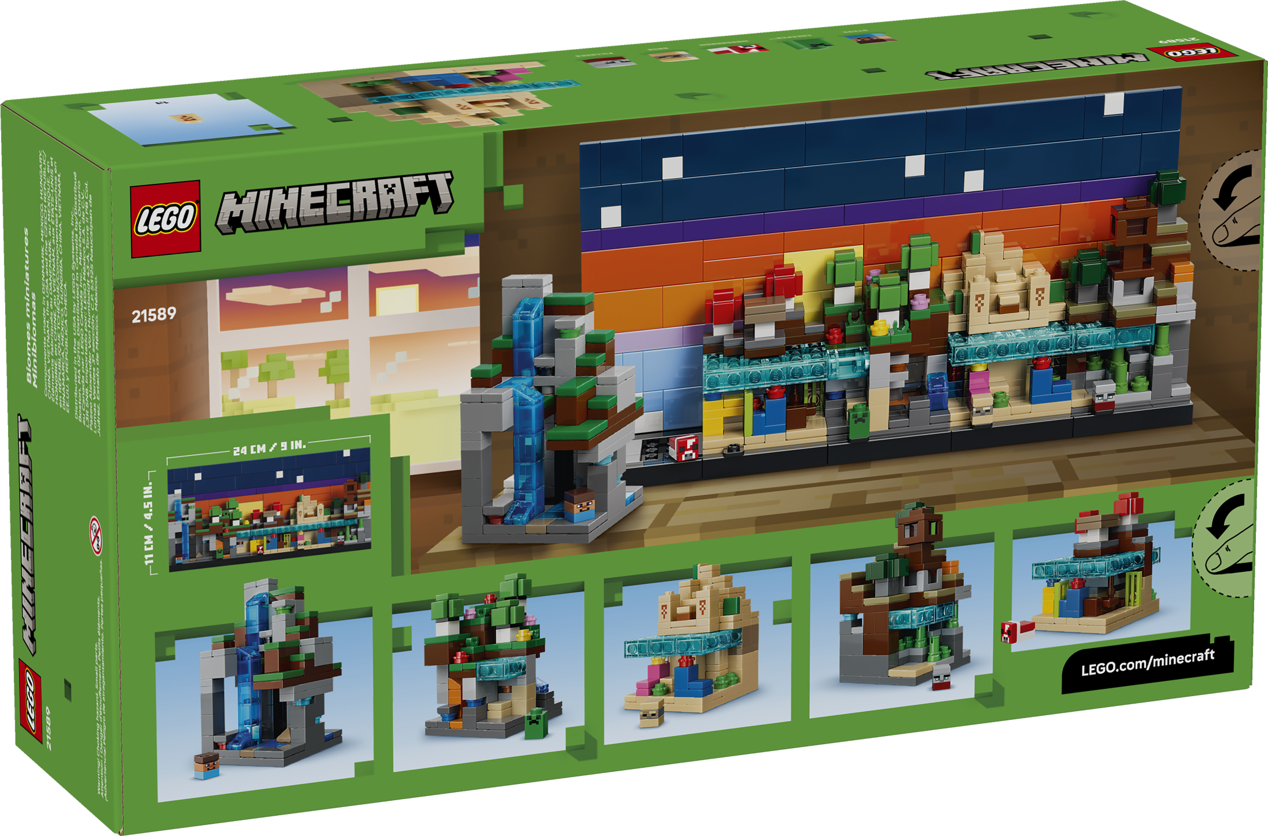 - 5 BIOME TOYS WITH MINECRAFT® FIGURES – The LEGO® set includes mountain, flower forest, mushroom fields, desert and savanna biomes and Steve, Creeper™, mooshroom, husk and pillager microfigures