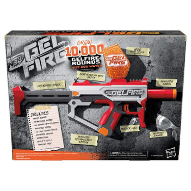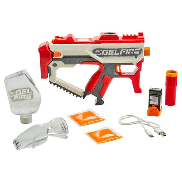 Burst into battle with Nerf Pro Gelfire blasters featuring hydrated rounds that burst on impact! These massive-capacity blasters deliver high-performance blasting to ignite your competitive advantage. Nerf Pro Gelfire rounds come dehydrated in the box, giving you a huge amount of rounds. Add water to hydrate the rounds to prepare them for use. The hydrated rounds fire from the blaster at a high velocity and burst when they hit a target. No need to pick up rounds! The Nerf Pro Gelfire Mythic fully automatic blaster includes a high-capacity 800-round hopper and 10,000 dehydrated Nerf Pro Gelfire soft super absorbent polymer projectiles. The gel blaster's innovative design combines exceptional quality and style. It has full-auto and semi-auto modes, removable barrel, extendable stock, protective eyewear, easy slide-in slide-out rechargeable battery, and universal USB-A to USB-C charging cable.