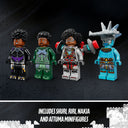 - 4 characters – Includes Shuri, Ironheart MK1, Nakia and Attuma minifigures, plus a spear, fighting rings and jetpack. The buildable Sunbird includes 2 stud shooters, rotatable engines and foldable wings