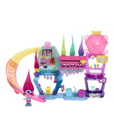 Welcome fans to Mount Rageous with this DreamWorks Trolls™ playset featuring Queen Poppy small doll, four Hair Pops™ friends, and 25+ accessories! Inspired by the iconic location from DreamWorks Trolls Band Together, the set offers two stories with a removable slide and other multiple areas of play, like a snack bar, dressing room, and stage. A Hair Pops™ launcher adds more happiness to playtime -- kids simply slide the gem across the bridge to see the Hair Pops™ fly!  With lots of storytelling fashions and pieces, the Mount Rageous playset encourages imaginations to create Trolls storylines that pop. Doll cannot stand alone. Colors and decorations may vary.