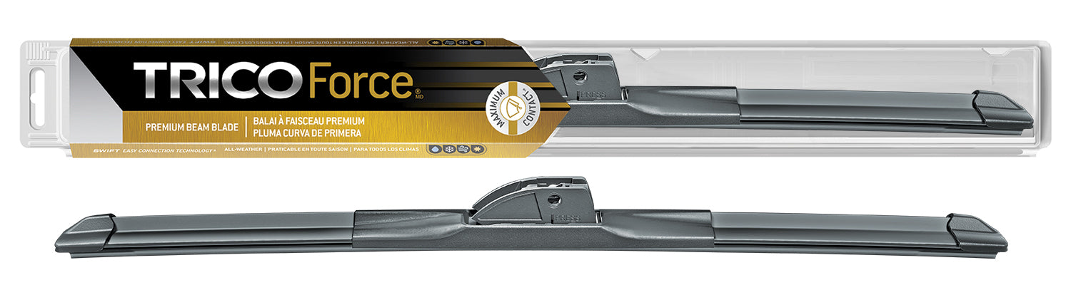 TRICO Force® is a robustly engineered high-wind beam wiper blade with a patented swept-wing spoiler that slices through wind speeds in excess of 135 mph (220 kph) caused by cross winds, buffeting truck winds and general traffic turbulence.