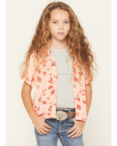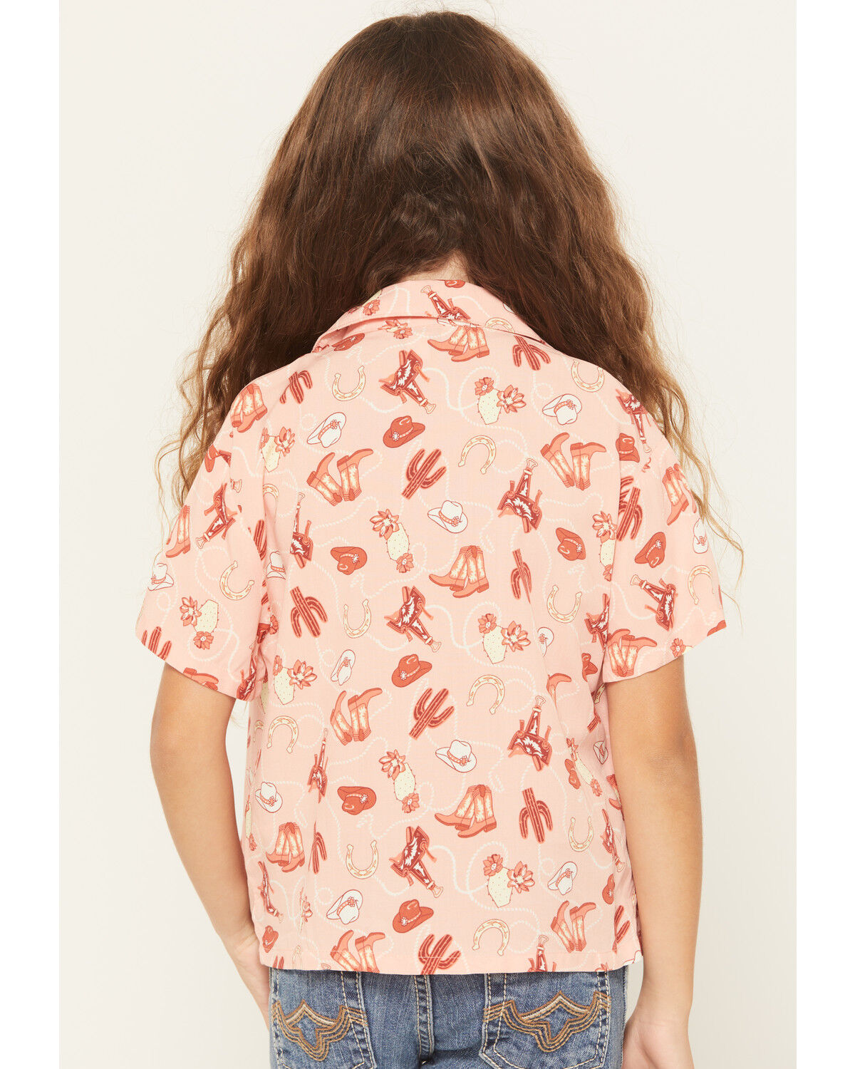 She'll have an extra dose of cowgirl spirit whenever she wears our Girl's Western Print Camp Shirt. It comes with a classic notched collar, pearl snaps, as well as a colorful print full of boots, hats, horseshoes, saddles, and more. It's crafted from rayon for softness and comfort in all the day-to-day activities.