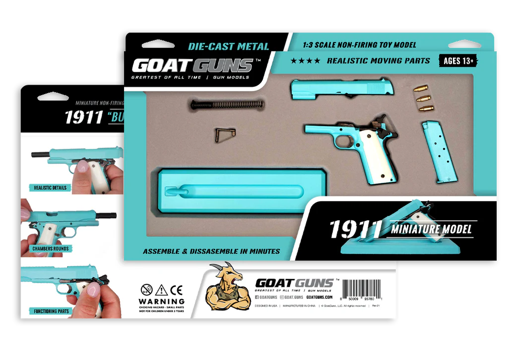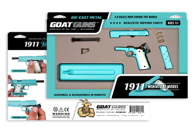 Nicknamed 'Bunny' this miniature 1911 is one for the ladies.  A soft Blue paint tone with ivory grips make it so she can enjoy GoatGuns too.  Add to the desk, makeup shelf or jewelry stand.  *Has cycling round feature.