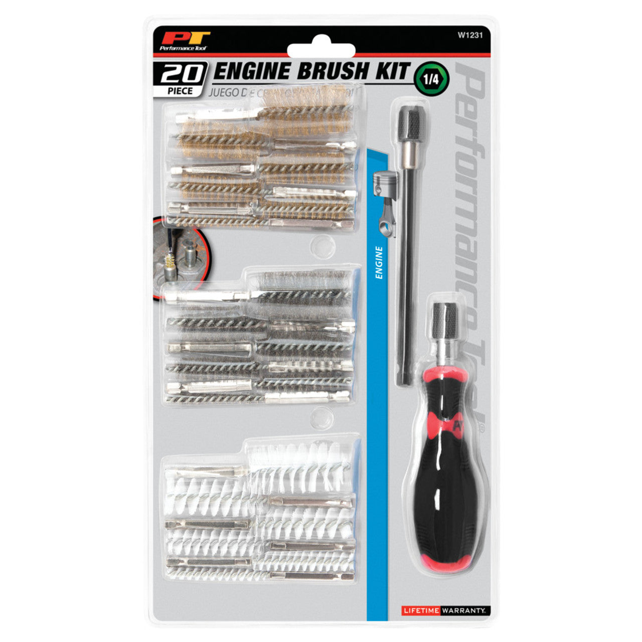 Clean pipes, small tubes and hard-to-reach areas with this engine brush kit. Includes 18 brushes for various applications.