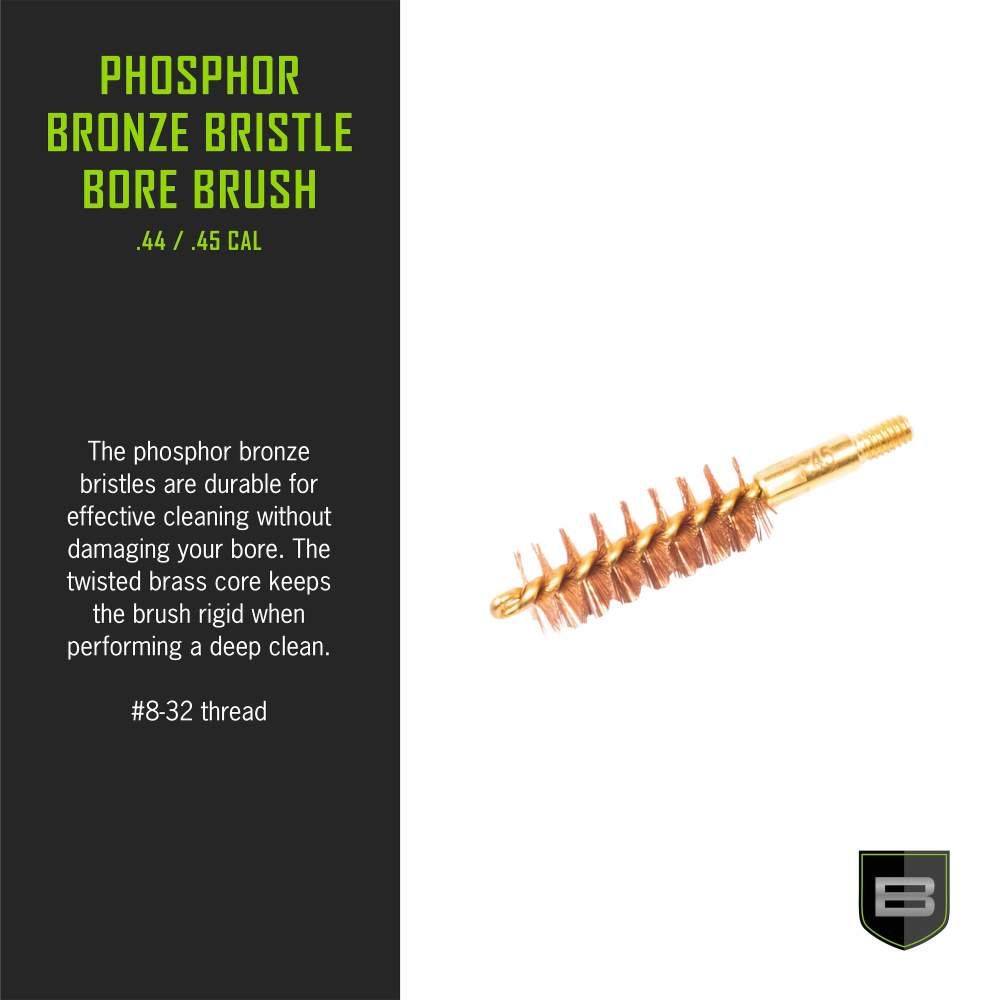 • GUN CLEANING BRUSH: This .44 / .45 Cal bronze bore brush features a #8-32 thread, rugged brass core & stiff bronze bristles to attack heavy carbon build-up in your firearm. Our gun brush is a handy accessory to add to your handgun cleaning kit.
