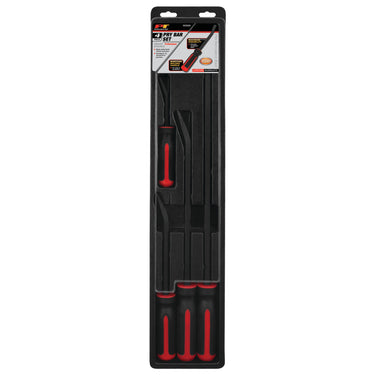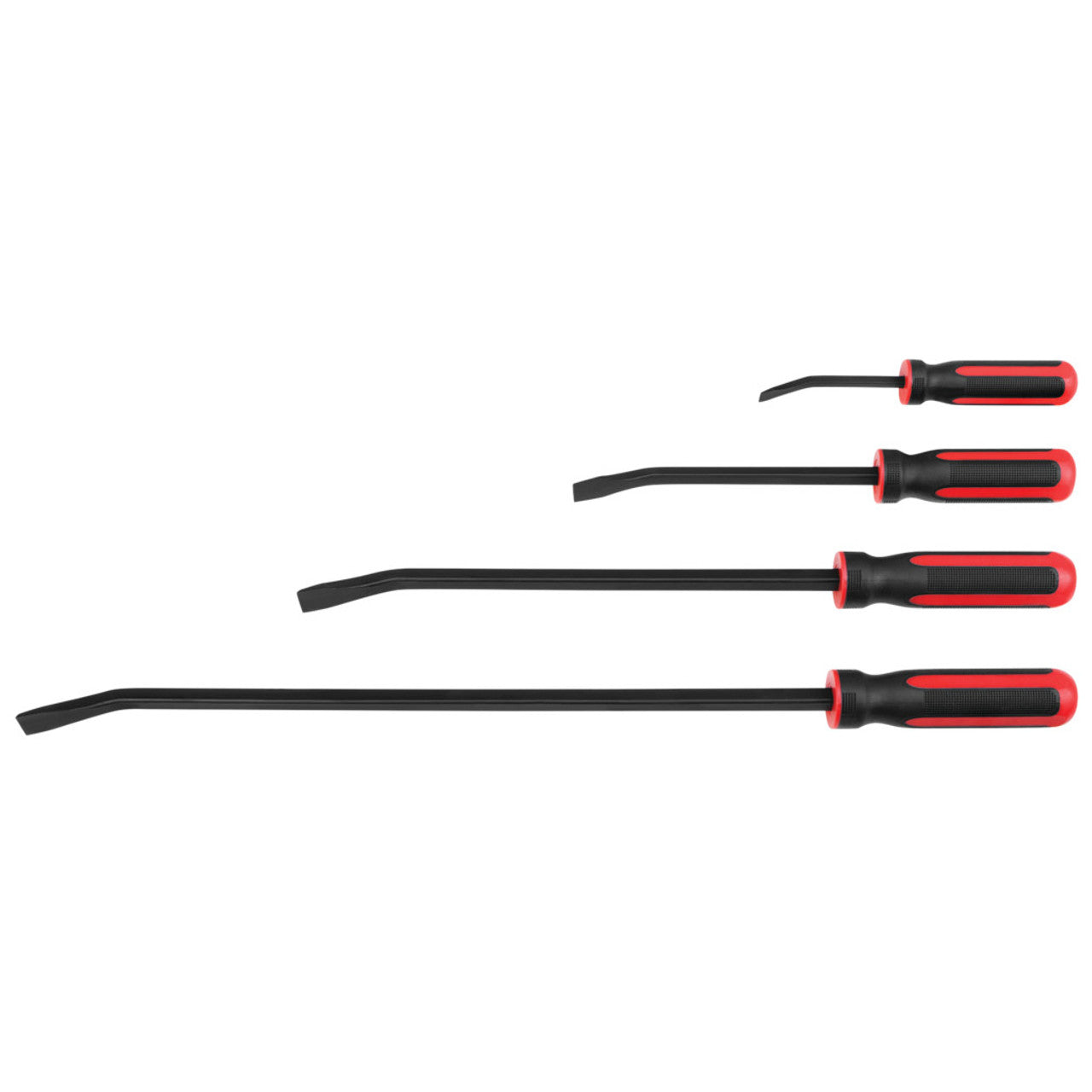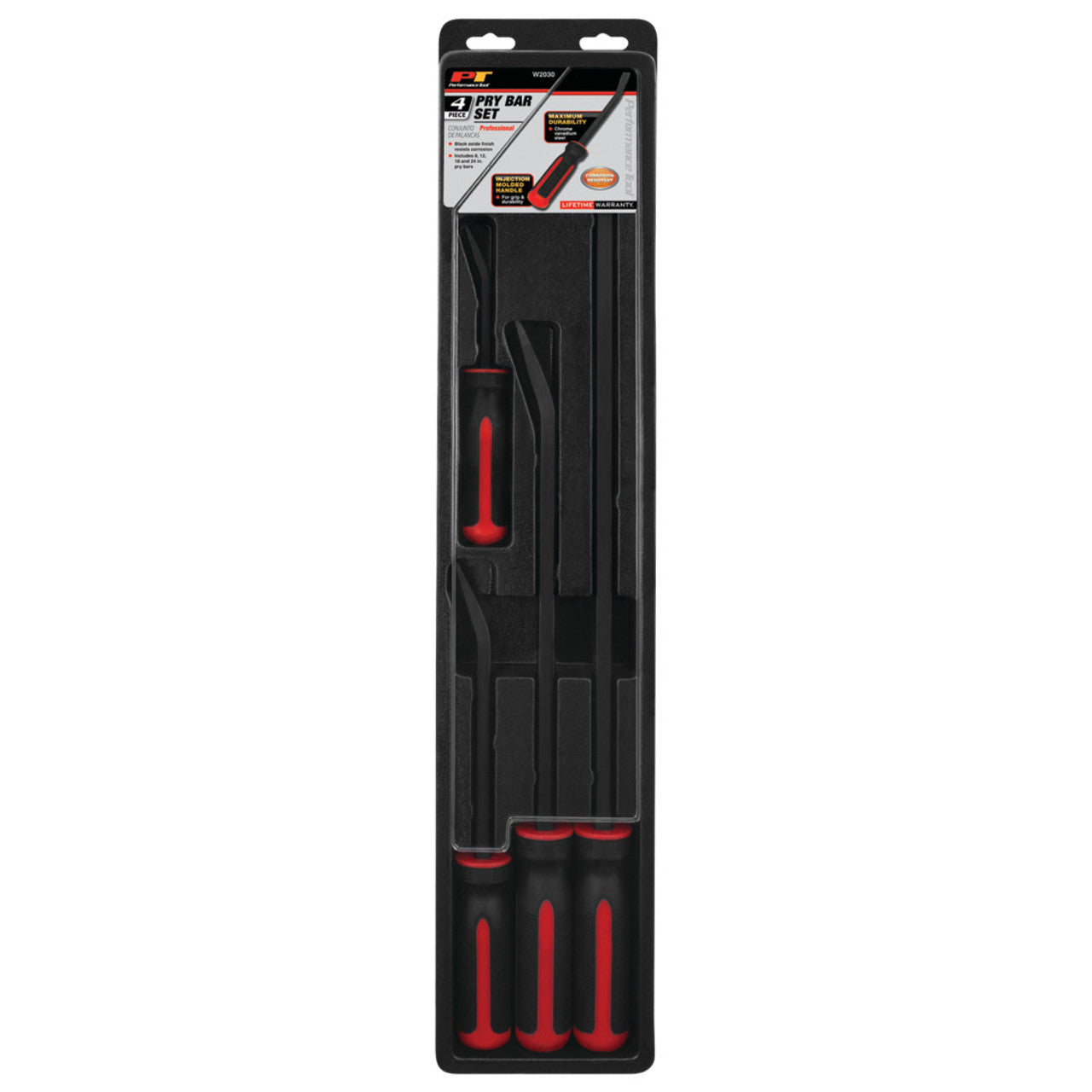 4-piece pry bar set with injection-molded handles and chrome vanadium steel shafts. Features a handy storage tray.