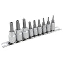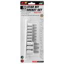 9-piece star bit socket set made from chrome vanadium and featuring a sand finish. Includes a bonus storage rail.