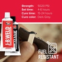 J-B Weld is The Original Cold Weld two-part epoxy system that provides strong, lasting repairs to metal and multiple surfaces. Mixed at a ratio of 1:1, it forms a permanent bond and can be shaped, tapped, filed, sanded and drilled after curing. At room temperature, J-B Weld sets in 4-6 hours to a dark grey color. A full cure is reached in 15-24 hours. J-B Weld has a tensile strength of 5020 PSI and sets to a hard bond overnight. It can withstand temperatures up to 550 degrees Fahrenheit when fully cured.