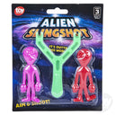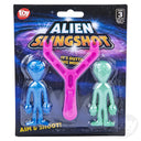 This 4" Alien Sling Shot set comes with two aliens and one slingshot. Stretch the alien and let it go to watch it soar. Assorted colors. Each piece is on a blister card.